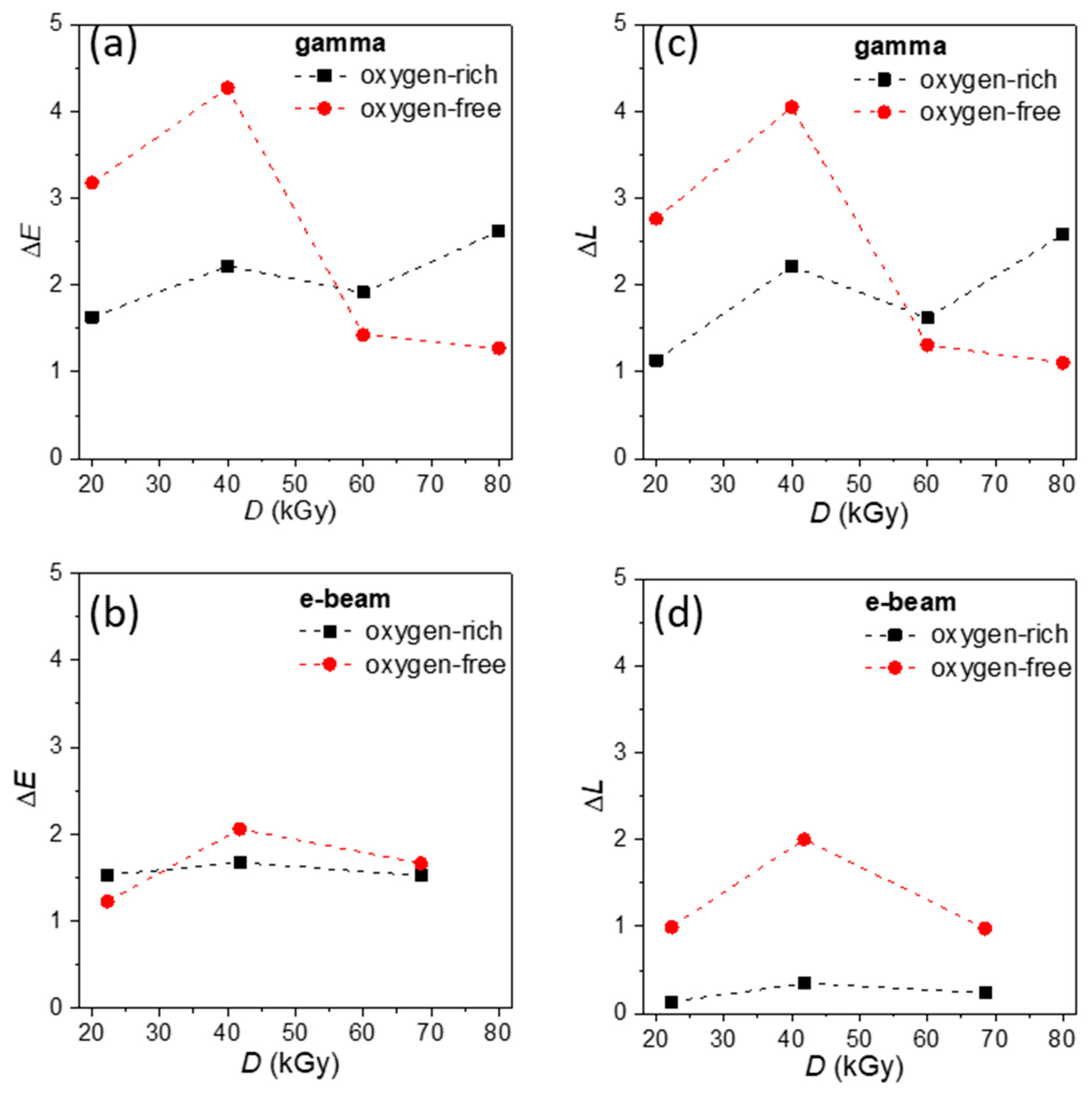 E increases up to 40 kGy and then slightly decreases at the highest applied dose, suggesting a weak saturation behavior of radiation-induced color changes. In an oxygen-rich atmosphere, the changes are less pronounced, with Δ