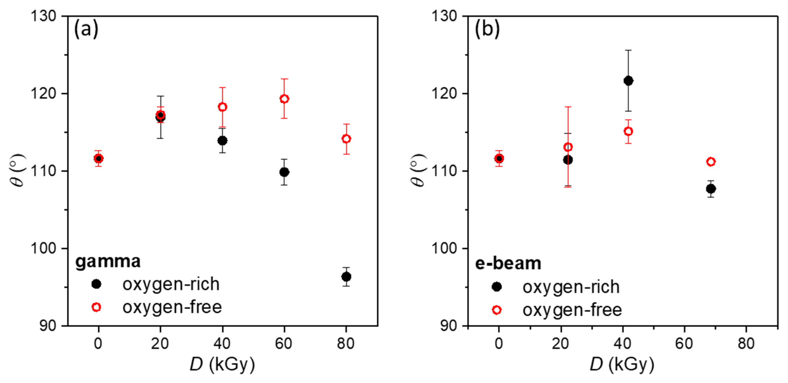 Figure 4b), the contact angle exhibits only moderate variations with increasing dose. For the electron-beam experiments, absorbed doses of 20, 40, and 70 kGy were applied, selected to approximate the gamma irradiation dose range while accounting for accelerator operating constraints. Although the nominal dose values do not exactly match those used for gamma irradiation, the selected dose window enables identification of the functional optimum within the investigated range. In an oxygen-rich atmosphere, a slight increase in contact angle is observed, followed by a minor decrease at the highest dose. A similar trend is found under oxygen-free conditions, although the absolute values remain slightly lower than those obtained in the presence of oxygen. The relatively small differences between the two atmospheres indicate that oxygen plays a less pronounced role in influencing surface hydrophobicity during e-beam treatment compared to gamma irradiation.