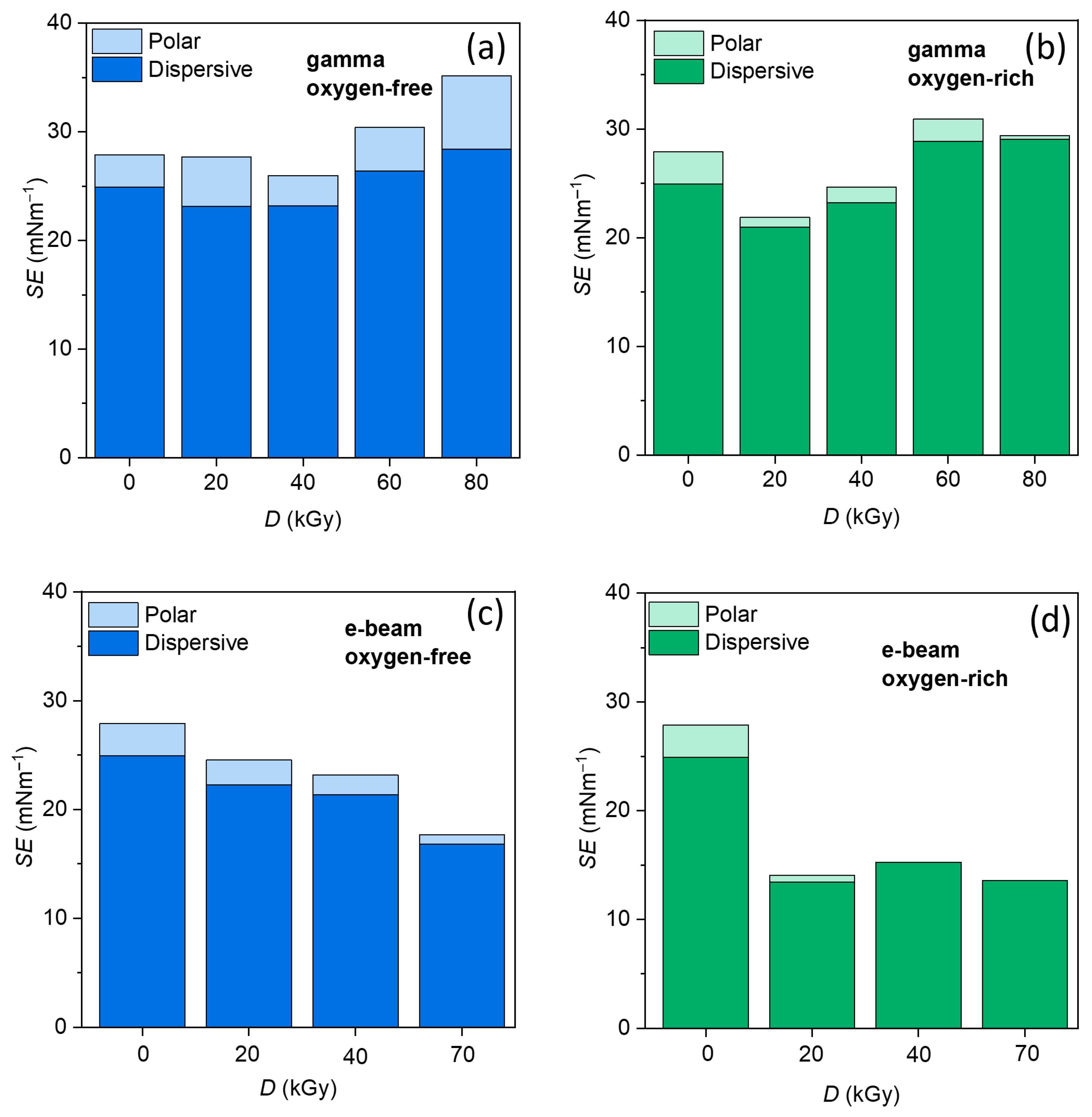 Figure 5d), markedly different behavior is observed, characterized by a rapid and pronounced reduction in surface free energy already at the lowest applied dose (20 kGy), followed by minor variations at higher doses. Despite these different kinetic behaviors, both irradiation atmospheres result in similarly low surface free energy values at higher doses, indicating that e-beam irradiation effectively promotes surface hydrophobization regardless of oxygen presence. This reduced sensitivity to atmospheric oxygen is consistent with the high dose rate of e-beam irradiation, which limits oxygen diffusion and suppresses oxygen-mediated degradation pathways.