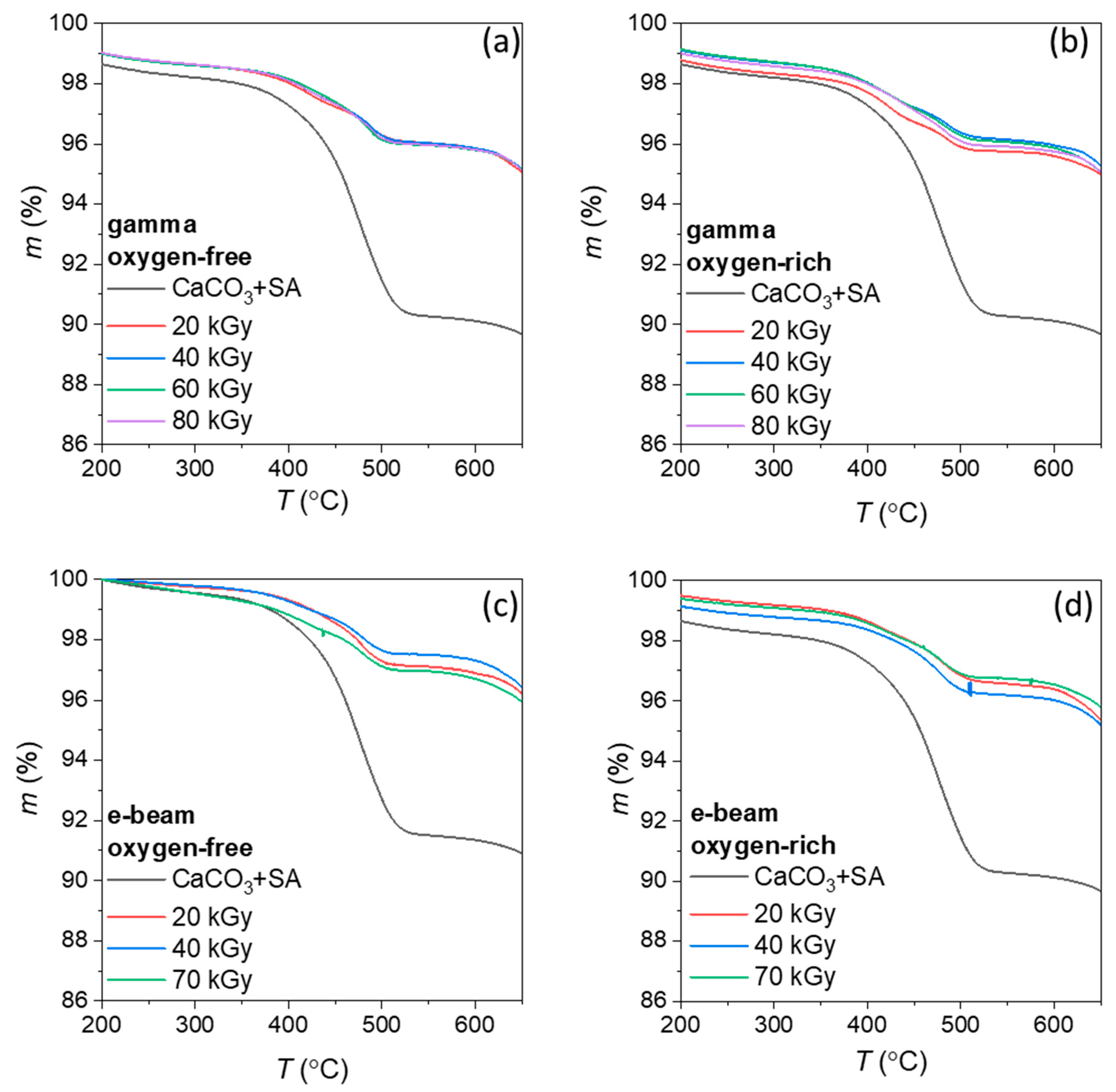 Overall, the TGA results indicate enhanced thermal resistance of the surface-bound SA layer after irradiation, which is consistent with radiation-induced stabilization of the organic coating while preserving the structural integrity of the CaCO3 substrate.