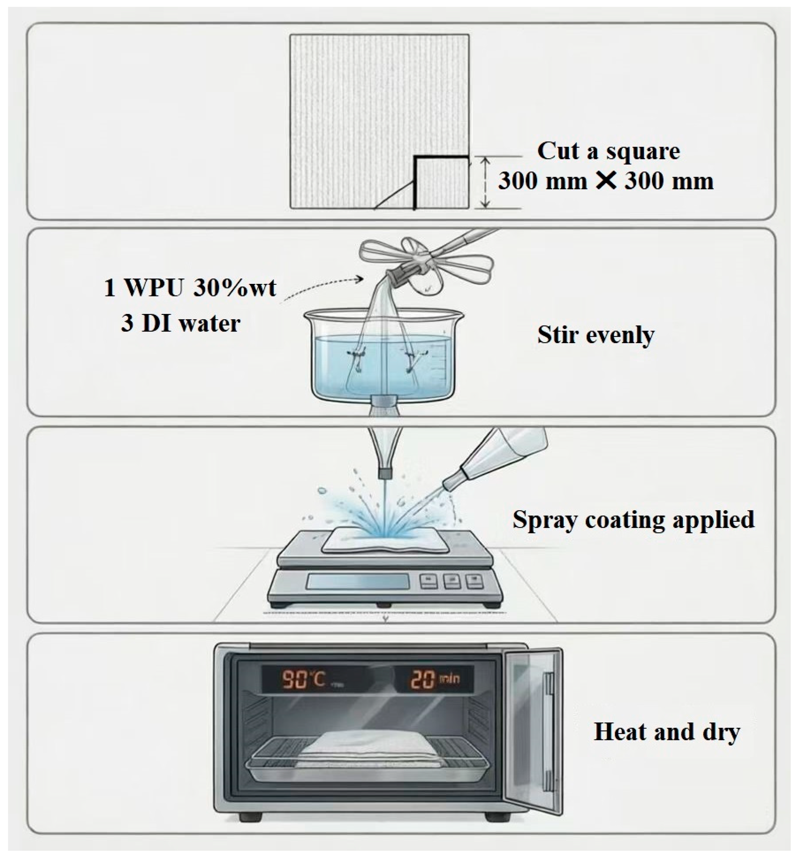 2, denier of 800 and thread-count of 40 × 30 yarns per inch. Ultimate tensile strength of individual fibre was 3.4 GPa. WPU was supplied by Feidun New Materials Technology Co., Shanghai, China. Additionally, 300 mm × 300 mm UHMWPE plain-woven fabric sheets were prepared. The prepared resin was mixed with deionized water at a ratio of 1:3, and the diluted mixture was evenly applied onto the fabric pieces. During impregnation, the resin content was controlled within 20 ± 3%. The impregnated materials were then placed in an oven and heated at 90 °C for 20 min. The preparation process is shown in