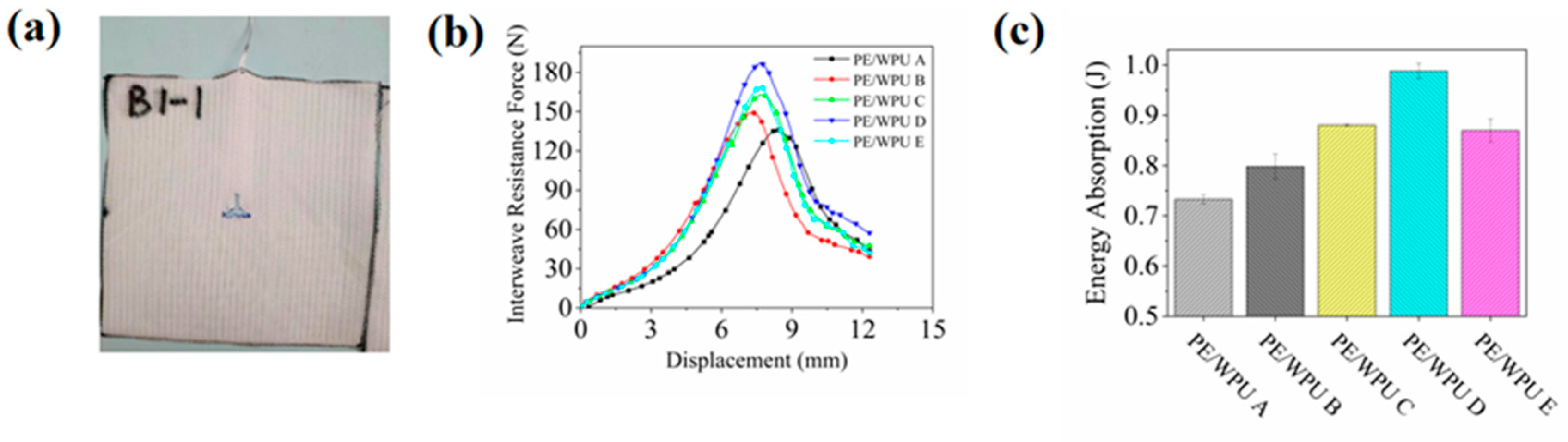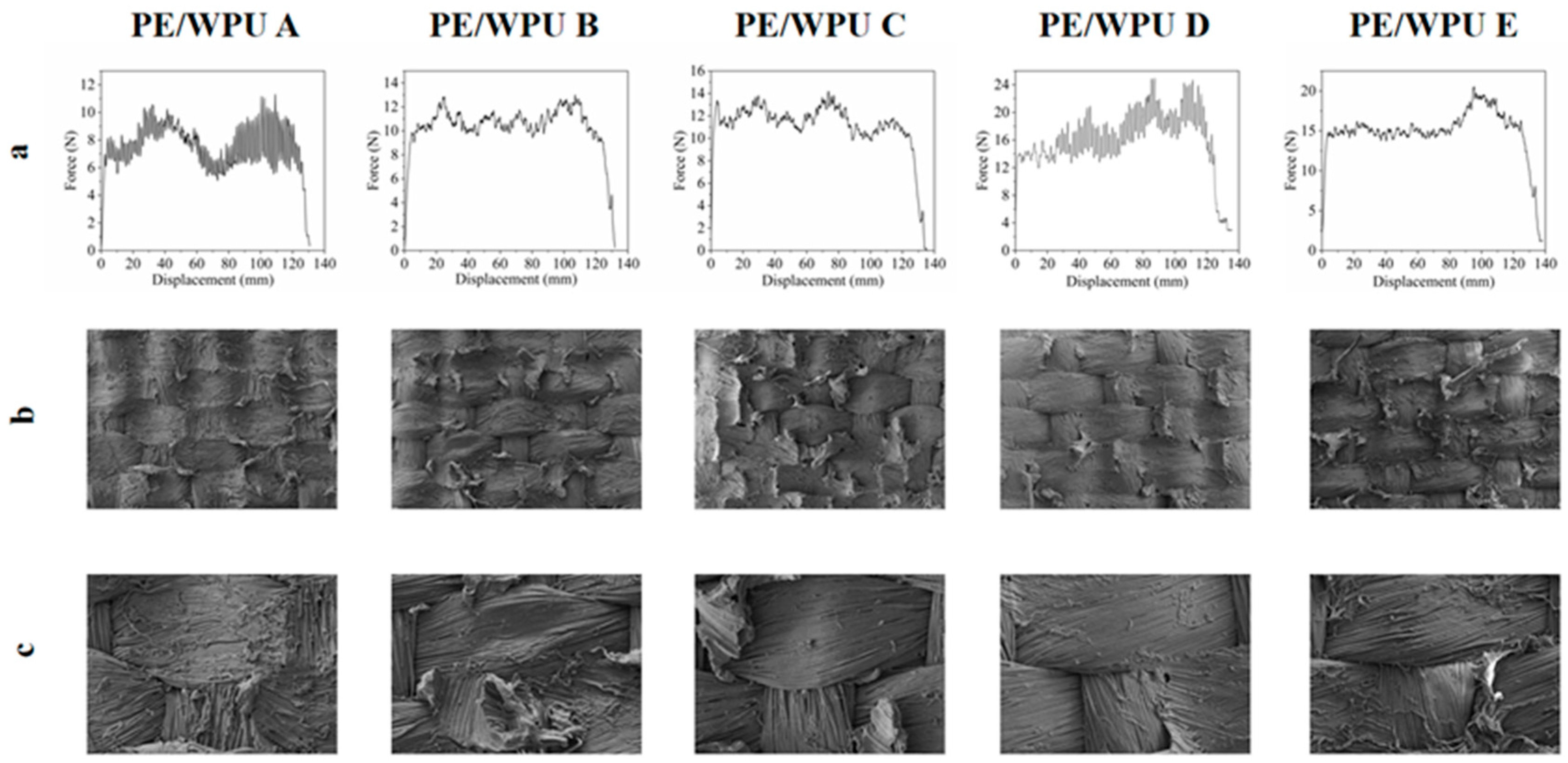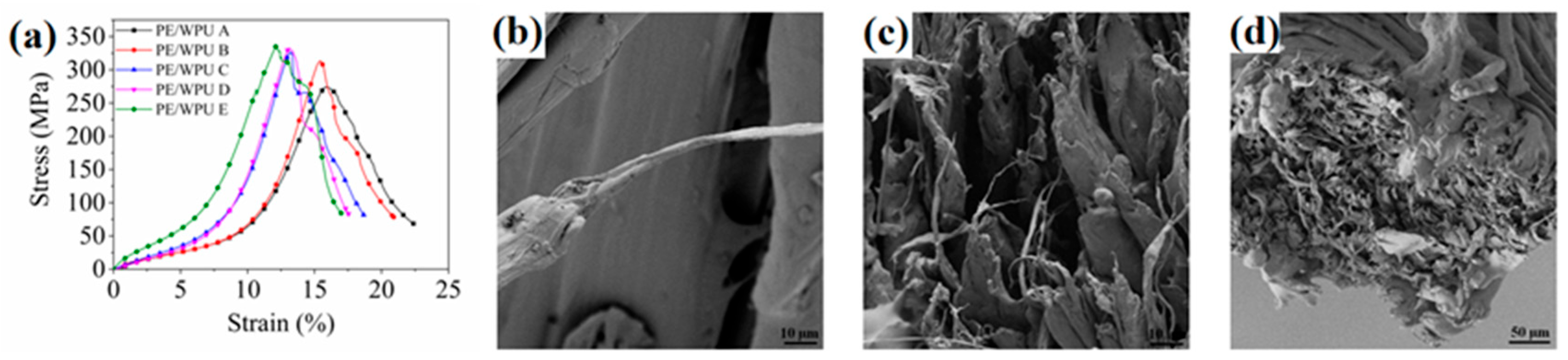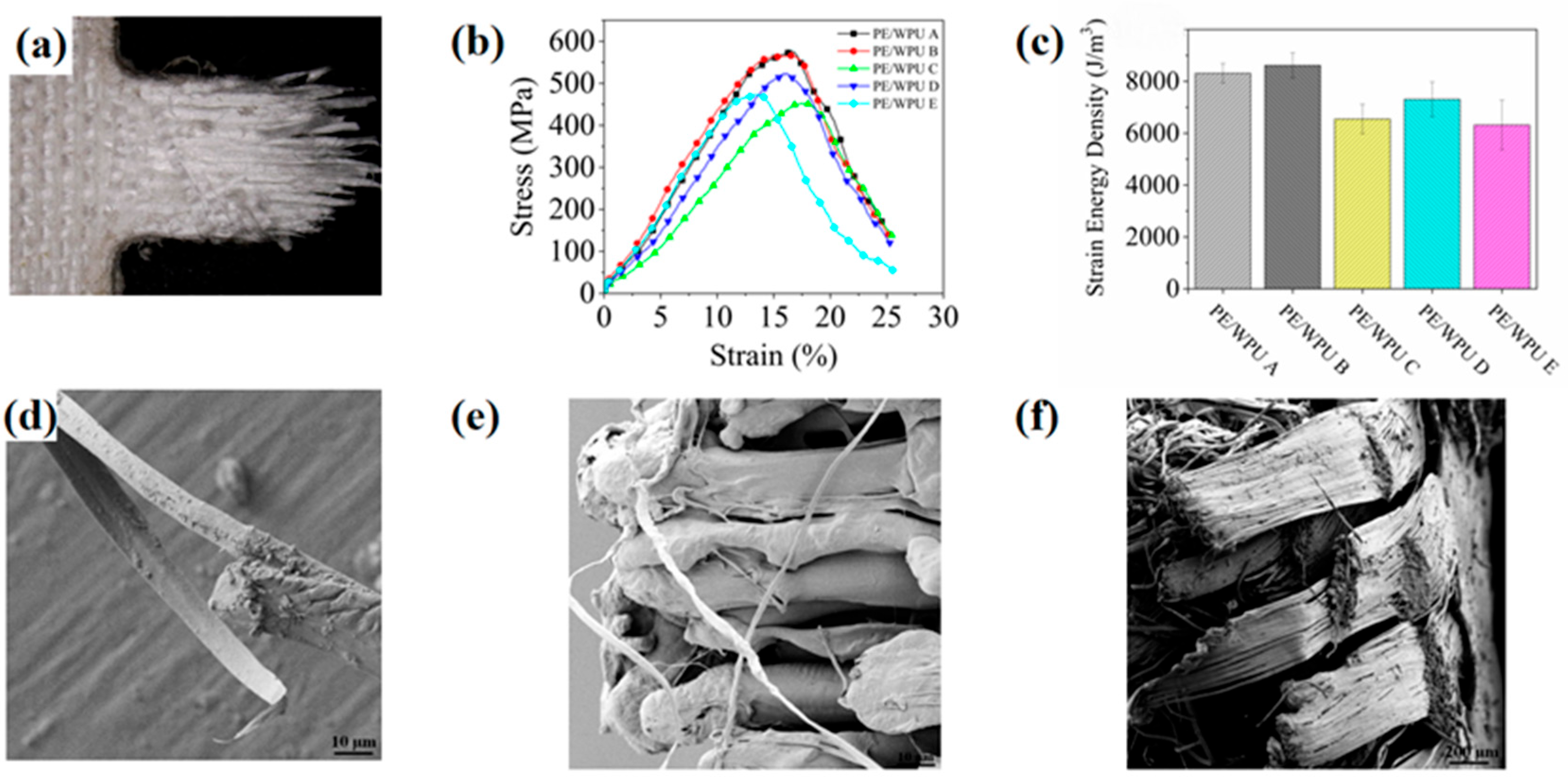 19], the tensile properties of the WPU X were tested using Instron 5566 electronic universal machine with a stretching rate of 10 mm/min. The quasi-static mechanical properties of PE/WPU laminates were assessed by cutting 300 mm × 300 mm samples from the laminates, with 5 specimens selected for each test. Tensile properties of these PE/WPU X laminates were measured using a universal testing machine (Instron 5982, Instron corporation, Norwood, MA, USA) in accordance with ASTM D3039 [