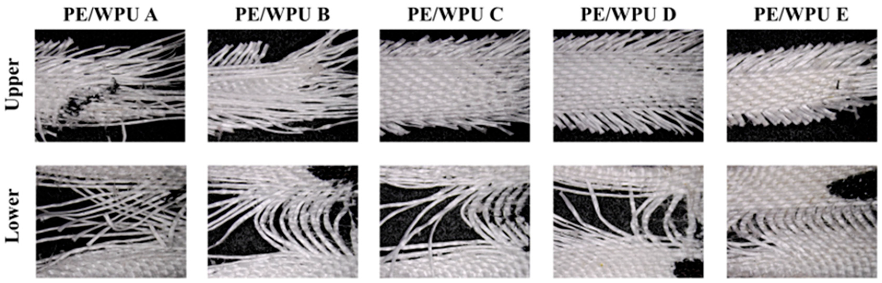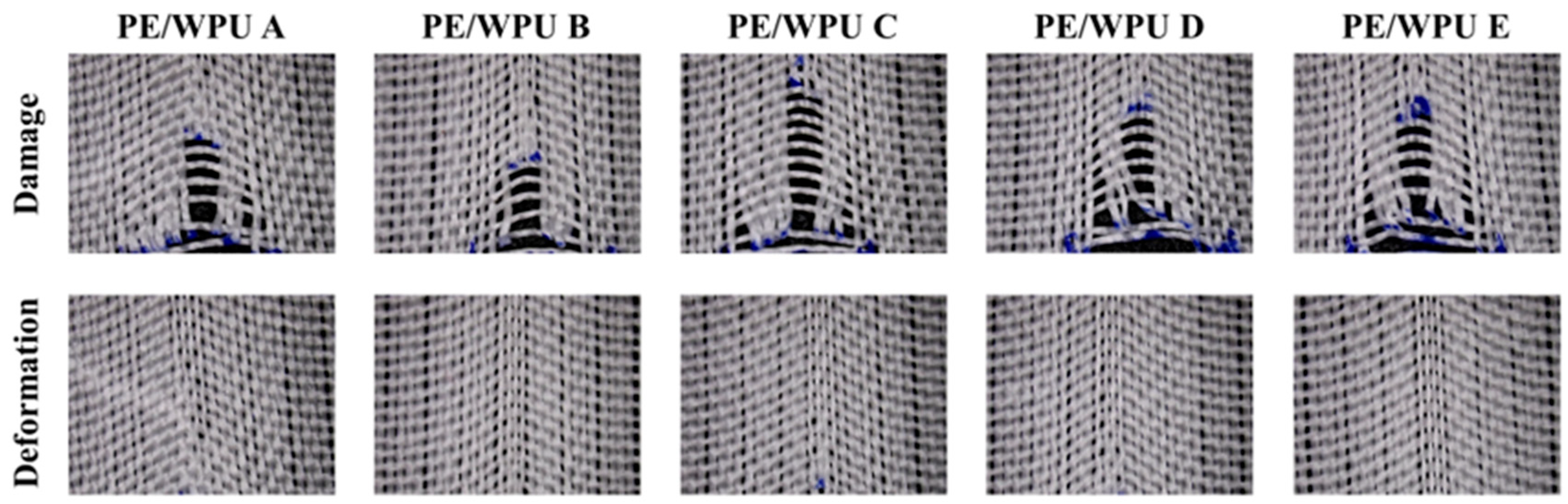 Subsequently, the PE/WPU X laminates were fabricated in a hot-pressing machine, incorporating layers of UHMWPE composites. The UHMWPE layers were meticulously stacked on the hot-press machine, with a layer of tetrafluoroethylene film placed on both the upper and lower surfaces to prevent bonding. The metal mould was then heated from room temperature to 90 °C at a heating rate of 5 °C/min and kept at a pressure of 4 MPa for 2 min. The moulding pressure was regulated at 0–5 MPa three times within the first 5 min to evacuate any bubbles inside the laminates. Finally, the machine was turned off while maintaining pressure to prevent deformation, allowing the PE/WPU X laminates to cool naturally to room temperature.