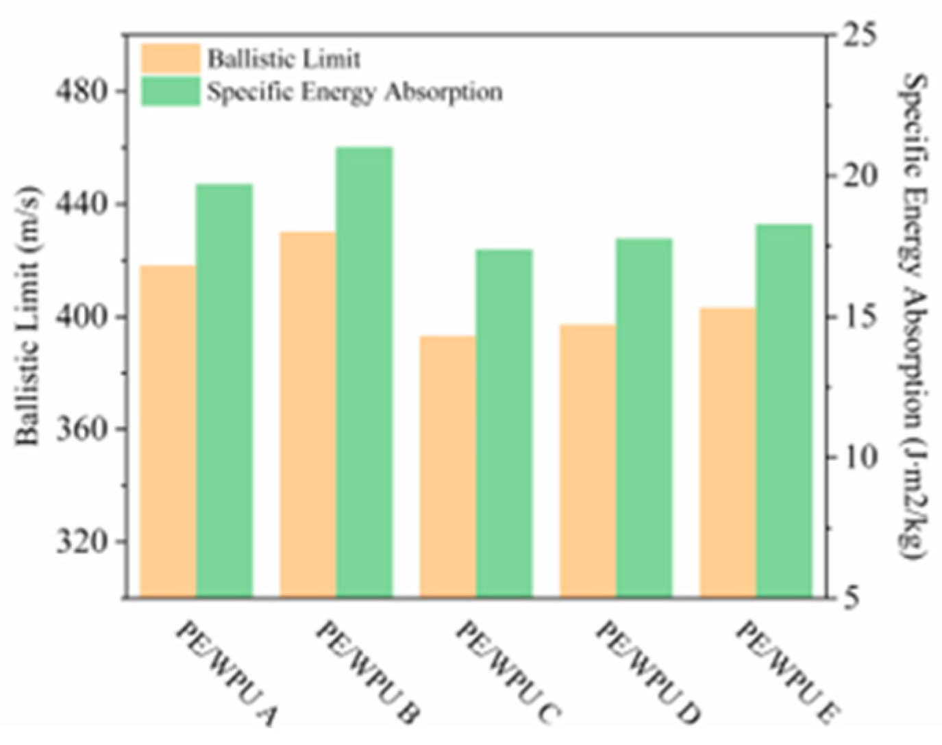 16] undertook a study on aramid-reinforced composites with diverse polycarbonate contents to explore the influence of resin contents on ballistic performance. The results demonstrated that the V50 value rose as the matrix content declined. Specifically, when the matrix content was reduced to 10%, the target plate presented the maximum V50 value of 550 m/s, along with a specific energy absorption (SEA) of 28.56 J∙m