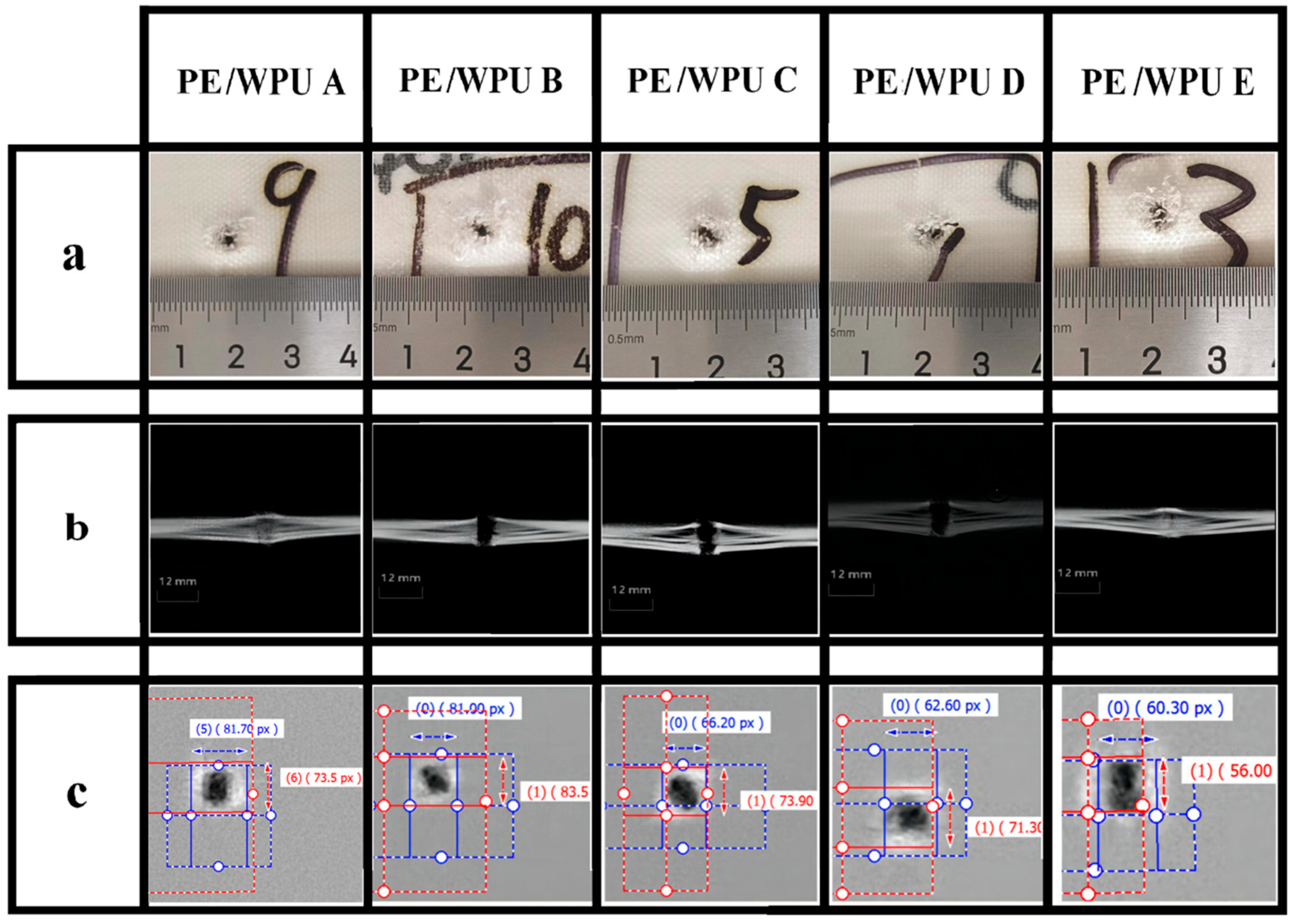 The HSR tensile test was conducted using PE/WPU X laminates, with the area density of each sample precisely controlled at 2.5 ± 0.1 kg/m