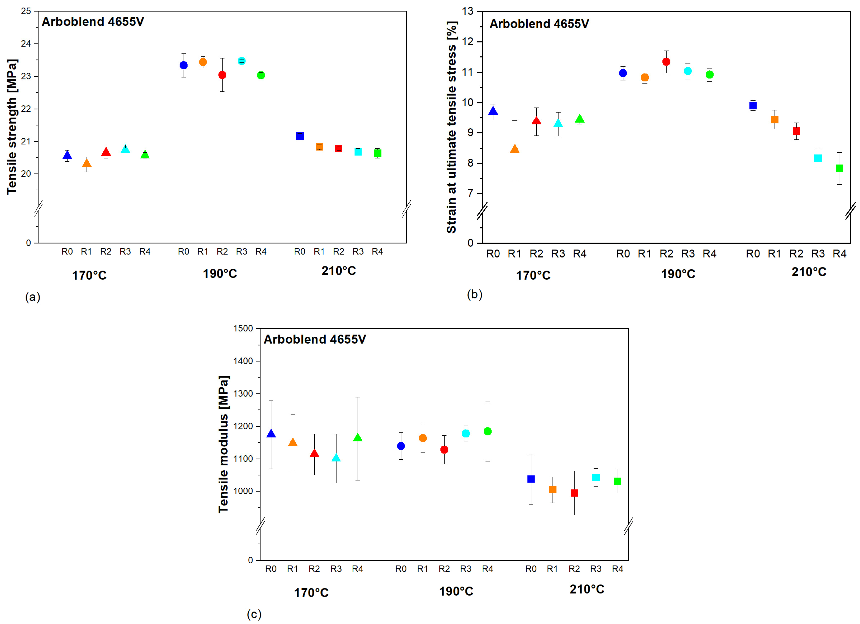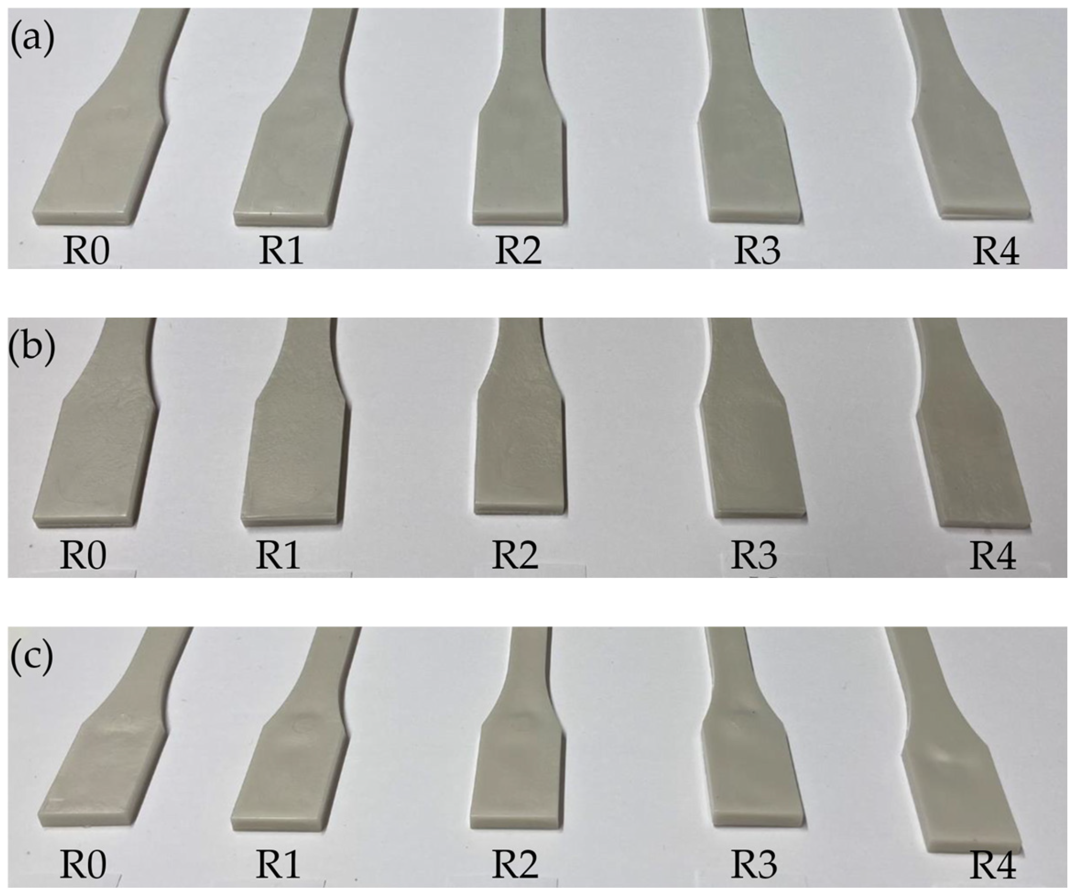 - DIN EN ISO 527-2; DIN Deutsches Institut für Normung e. V. Kunststoffe—Bestimmung der Zugeigenschaften—Teil 2: Prüfbedingungen für Form- und Extrusionsmassen. DIN Deutsches Institut für Normung e. V. Kunststoffe: Berlin, Germany, 2012.