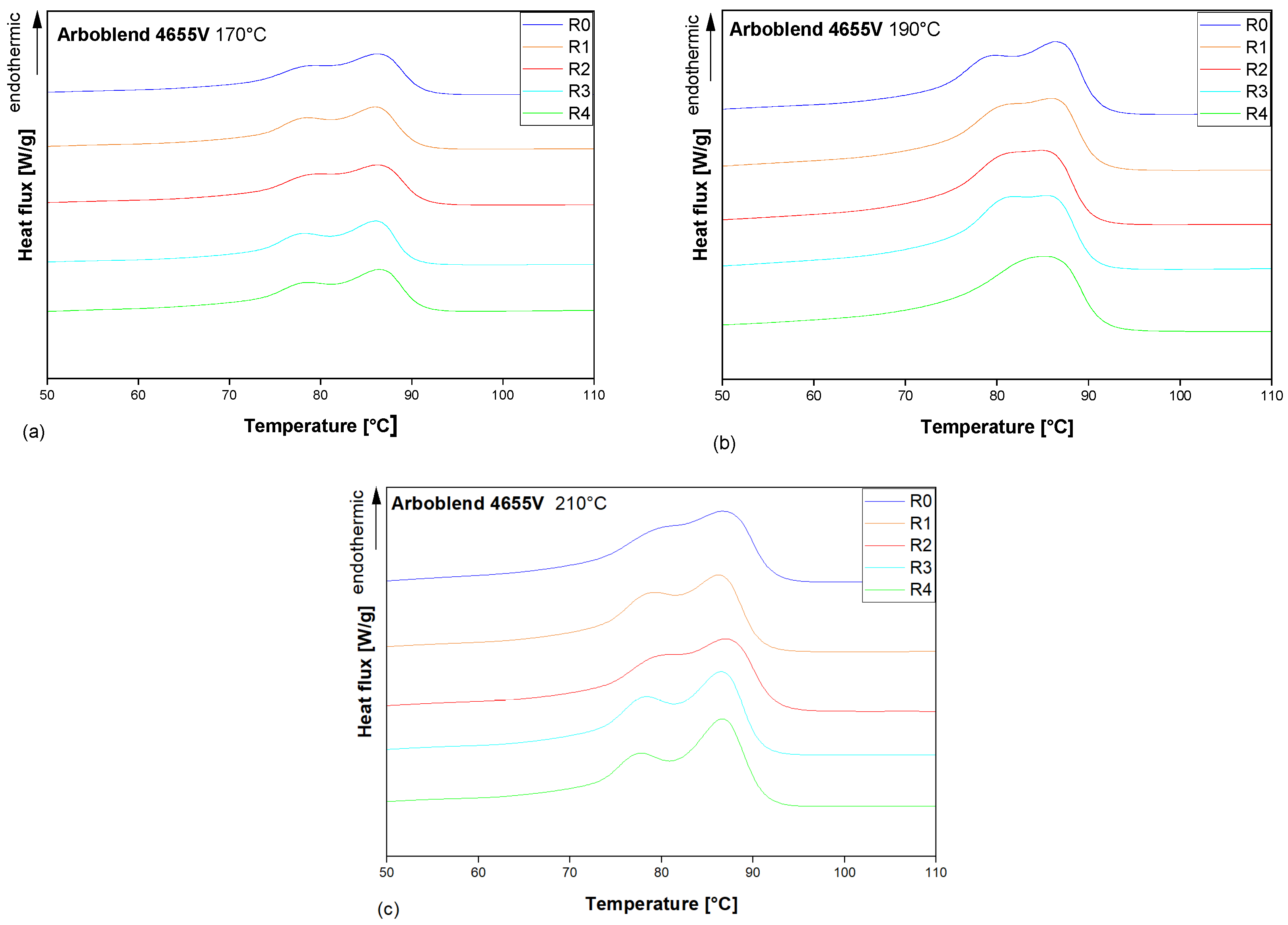 | Processing Temperature | Recycling Run | 1st Peak [°C] | 2nd Peak [°C] | Onset [°C] | Offset [°C] | Enthalpy [J/g] |