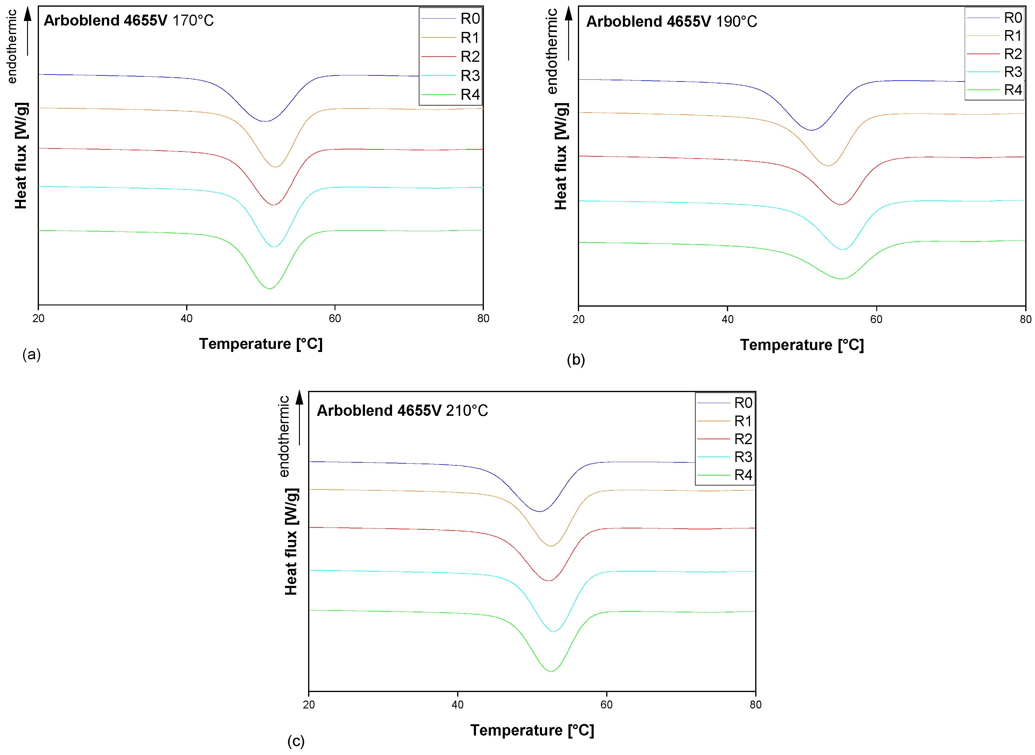 | Processing Temperature | Recycling Run | Peak [°C] | Onset [°C] | Offset [°C] | Enthalpy [J/g] |