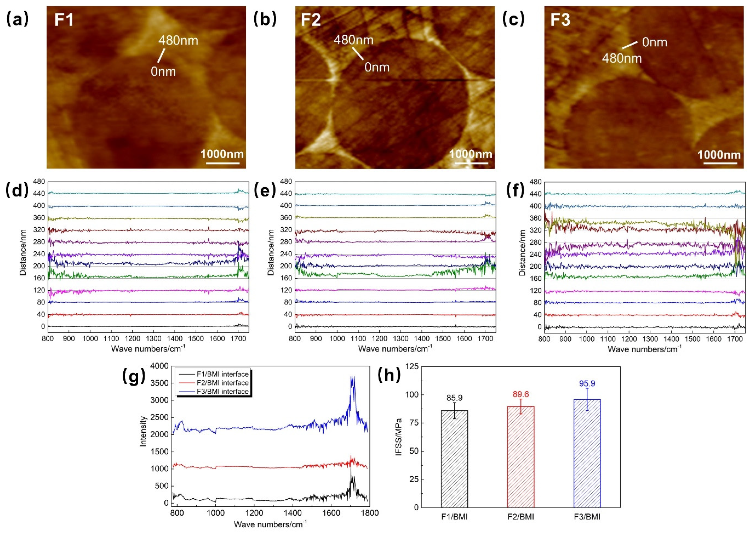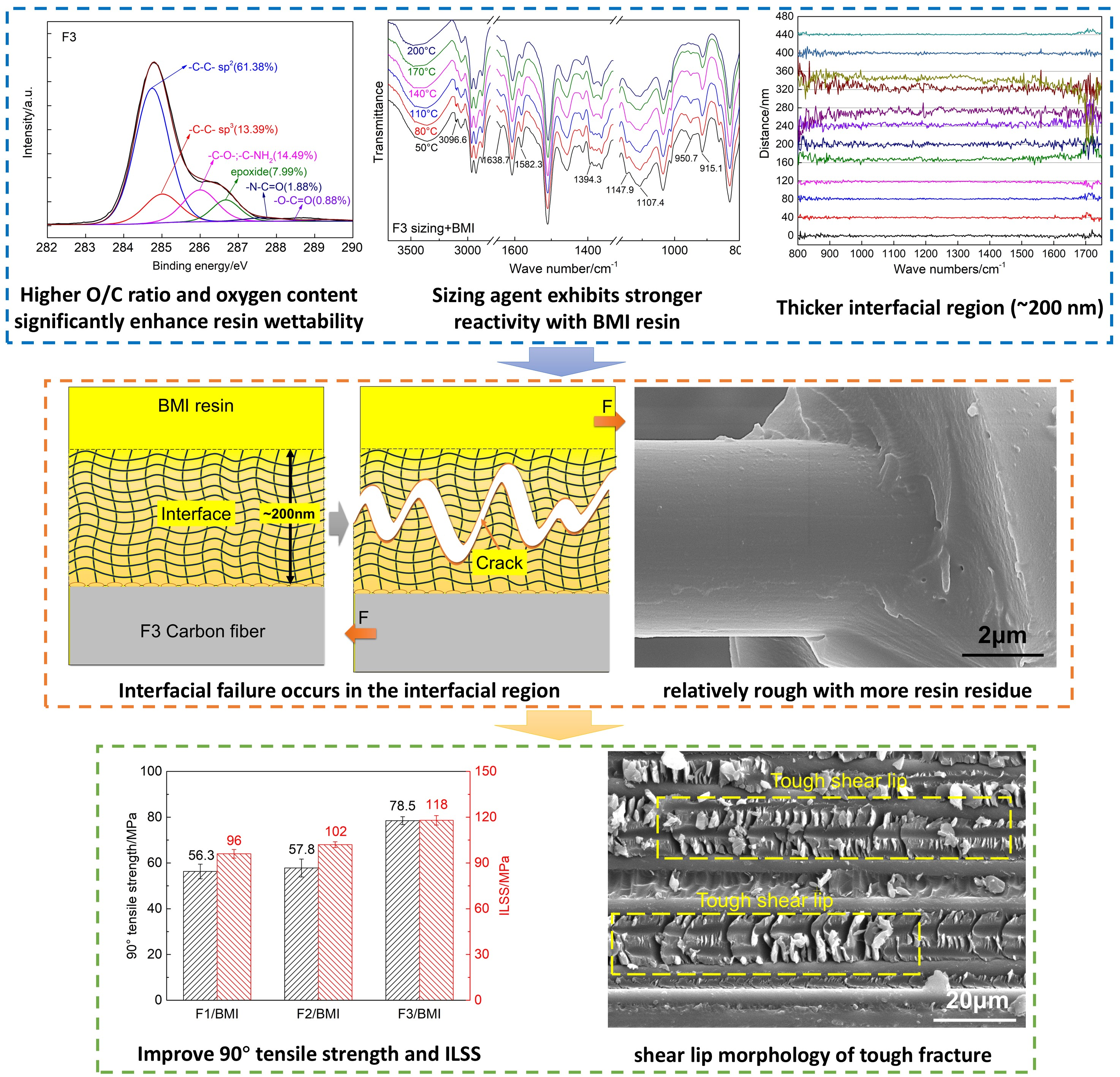 - The interfacial region was innovatively characterized by nano-infrared spectroscopy. The interfacial thicknesses are approximately 80 nm for F1, 160 nm for F2, and 200 nm for F3. Interfacial shear strength (IFSS) follows the order F3 (95.9 MPa) > F2 (89.6 MPa) > F1 (85.9 MPa), showing a positive quantitative correlation with interfacial thickness and chemical bonding strength.