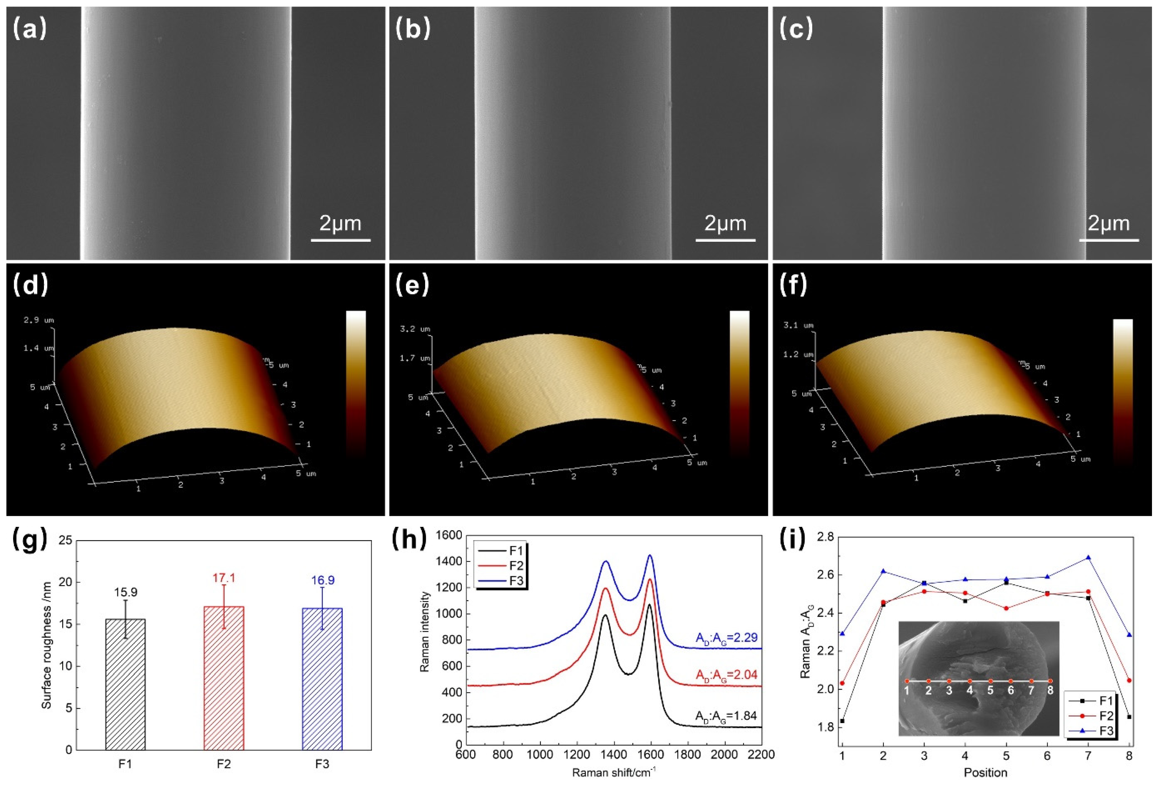 - Dry-jet wet-spun T1100-grade CFs exhibit a smooth surface with no obvious grooves and similar surface roughness (approximately 16~17 nm). Thus, the contribution of mechanical interlocking to the CF/BMI interfacial bonding is negligible.