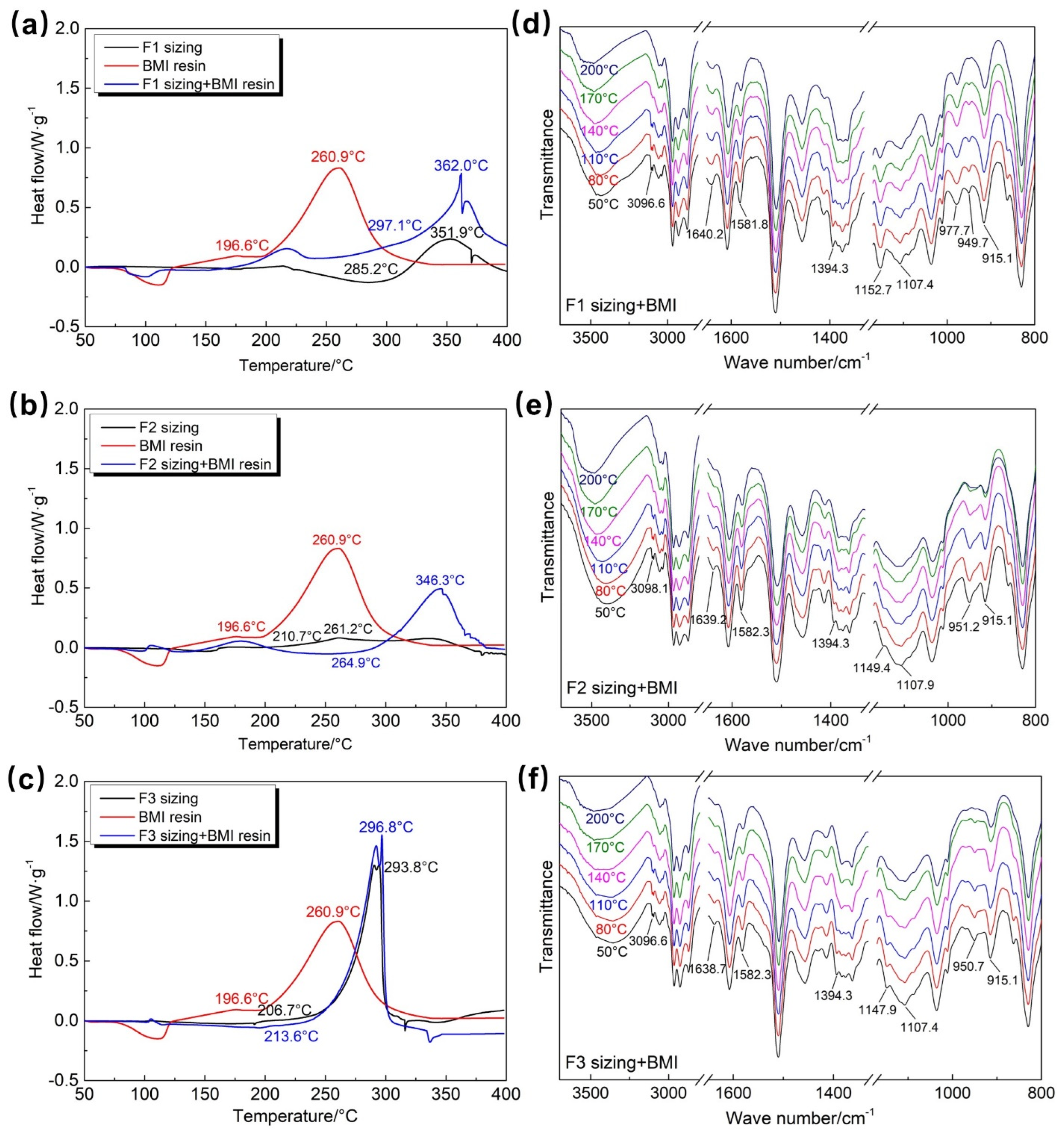 - The reactivity between different sizing agents and BMI resin varies considerably. F1 sizing neither cures nor participates in resin curing; F2 sizing shows low self-curing reactivity, with a reaction enthalpy of only 13.1 J/g and weak reaction with the resin; F3 sizing exhibits strong self-curing reactivity, with a reaction enthalpy of 183.8 J/g and high reactivity with the resin, which effectively improves interfacial bonding strength.
