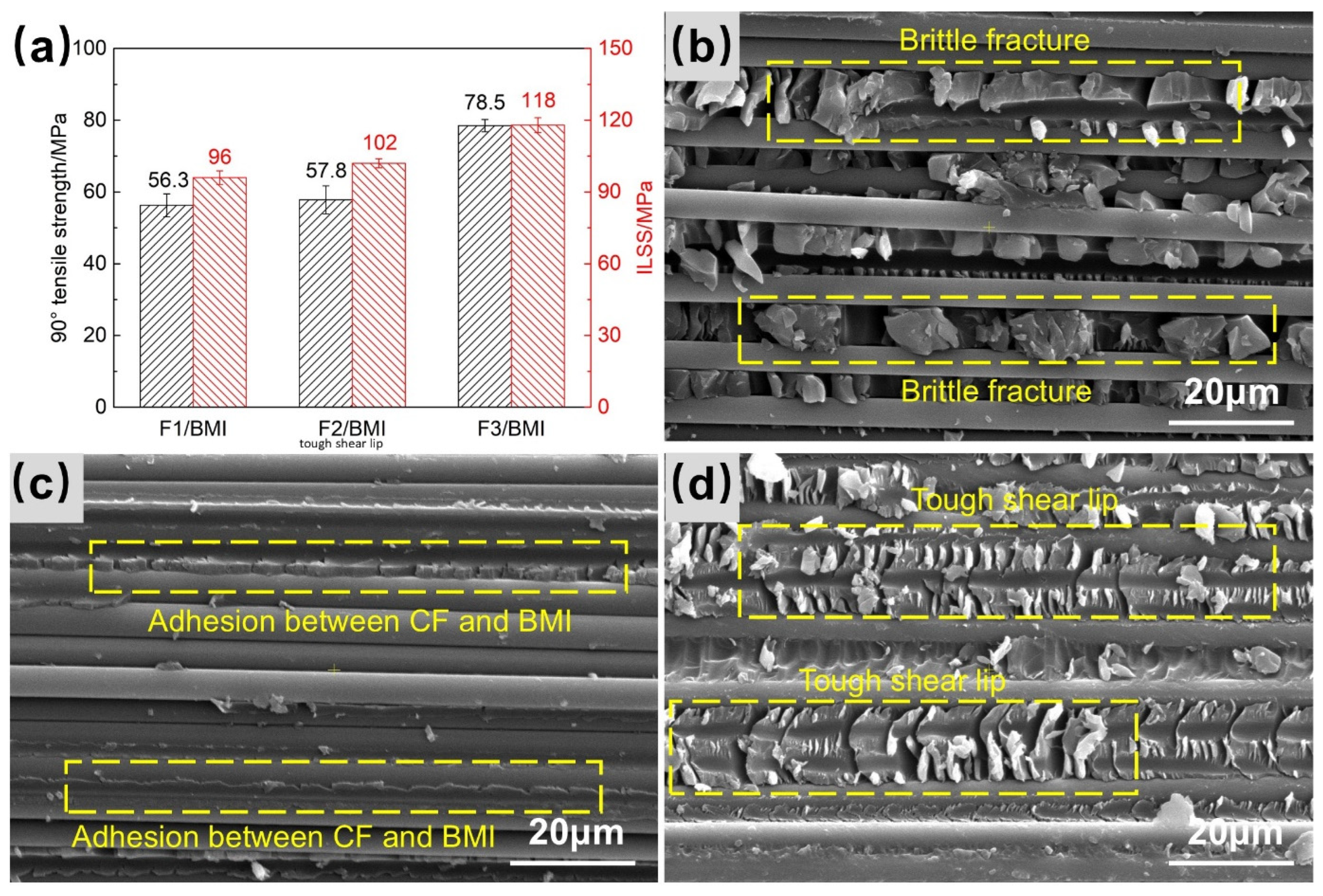 - The quantitative correlation among fiber surface characteristics, interfacial structure, and macro-mechanical properties was established. Constructing a “thick and strong” interfacial region increases IFSS by 11.6% from F1 (85.9 MPa) to F3 (95.9 MPa) and significantly enhances the 90° tensile strength up to 78.5 MPa and interlaminar shear strength (ILSS) up to 118 MPa, driving the failure mode from brittle to ductile.