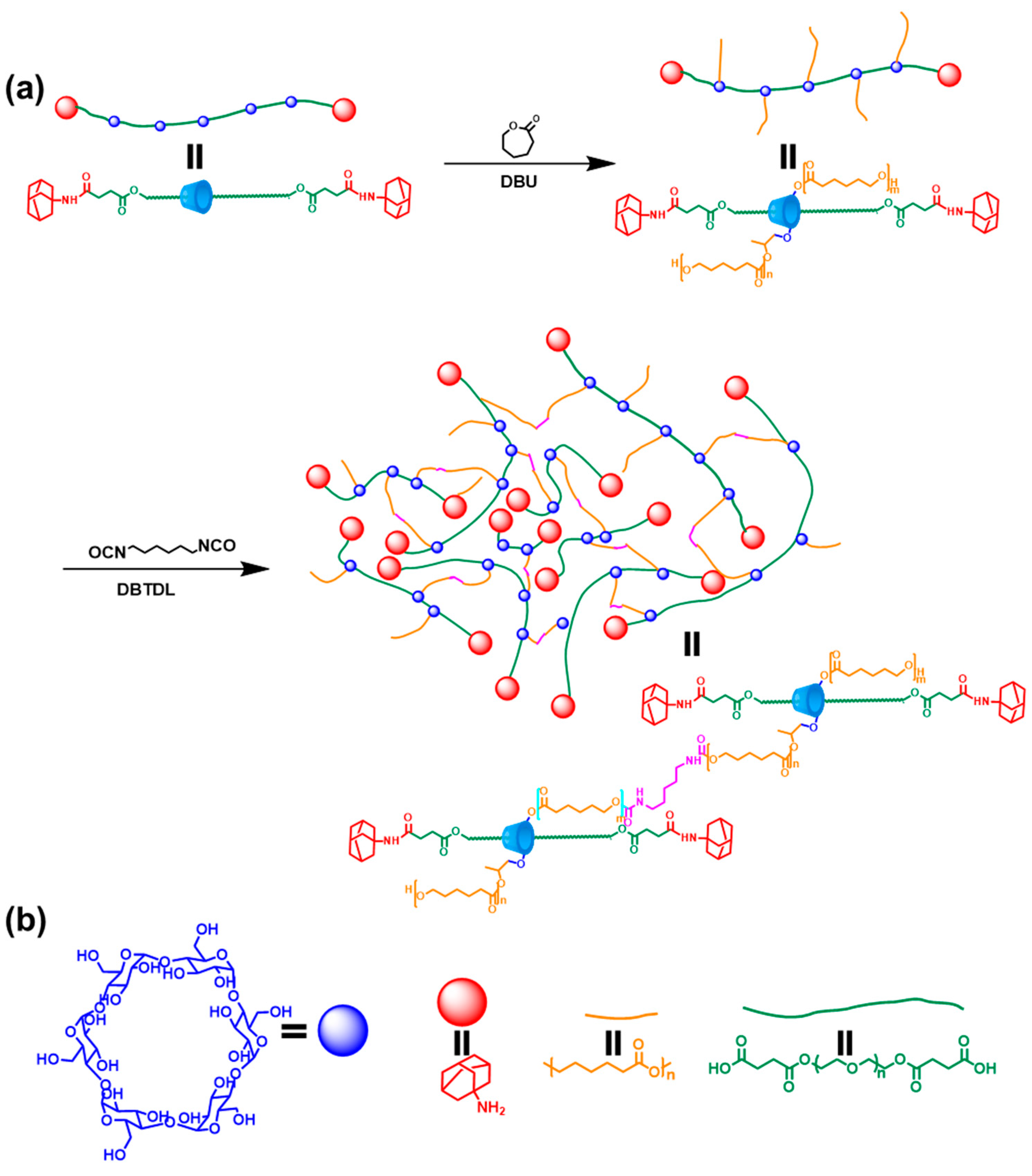 - Kato, K.; Hori, A.; Ito, K. An efficient synthesis of low-covered polyrotaxanes grafted with poly(ε-caprolactone) and the mechanical properties of its cross-linked elastomers. Polymer 2018, 147, 67–73. [Google Scholar] [CrossRef]