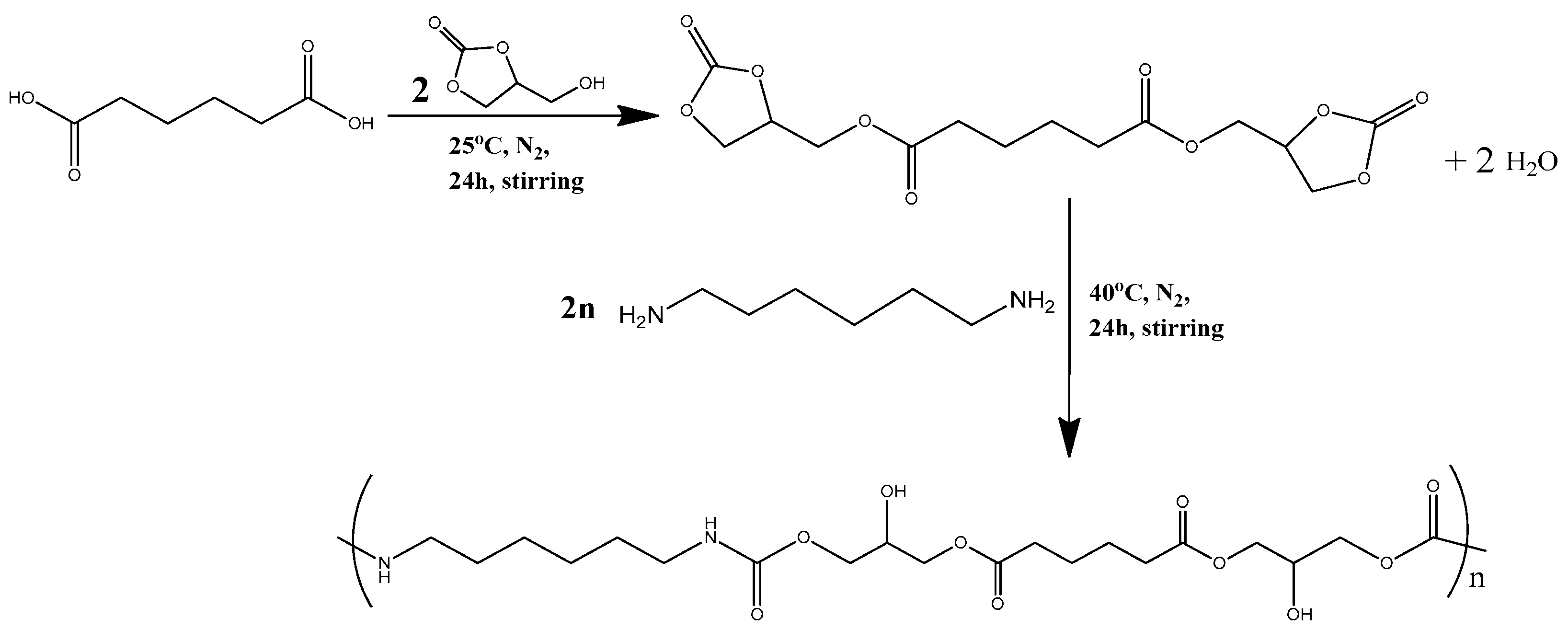 - Ntrivala, M.A.G.; Balla, E.D.; Klonos, P.A.; Kyritsis, A.; Bikiaris, D.N. Synthesis and Characterization of Novel Non-Isocyanate Polyurethanes Derived from Adipic Acid: A Comprehensive Study. Polymers 2025, 17, 728. [Google Scholar] [CrossRef]