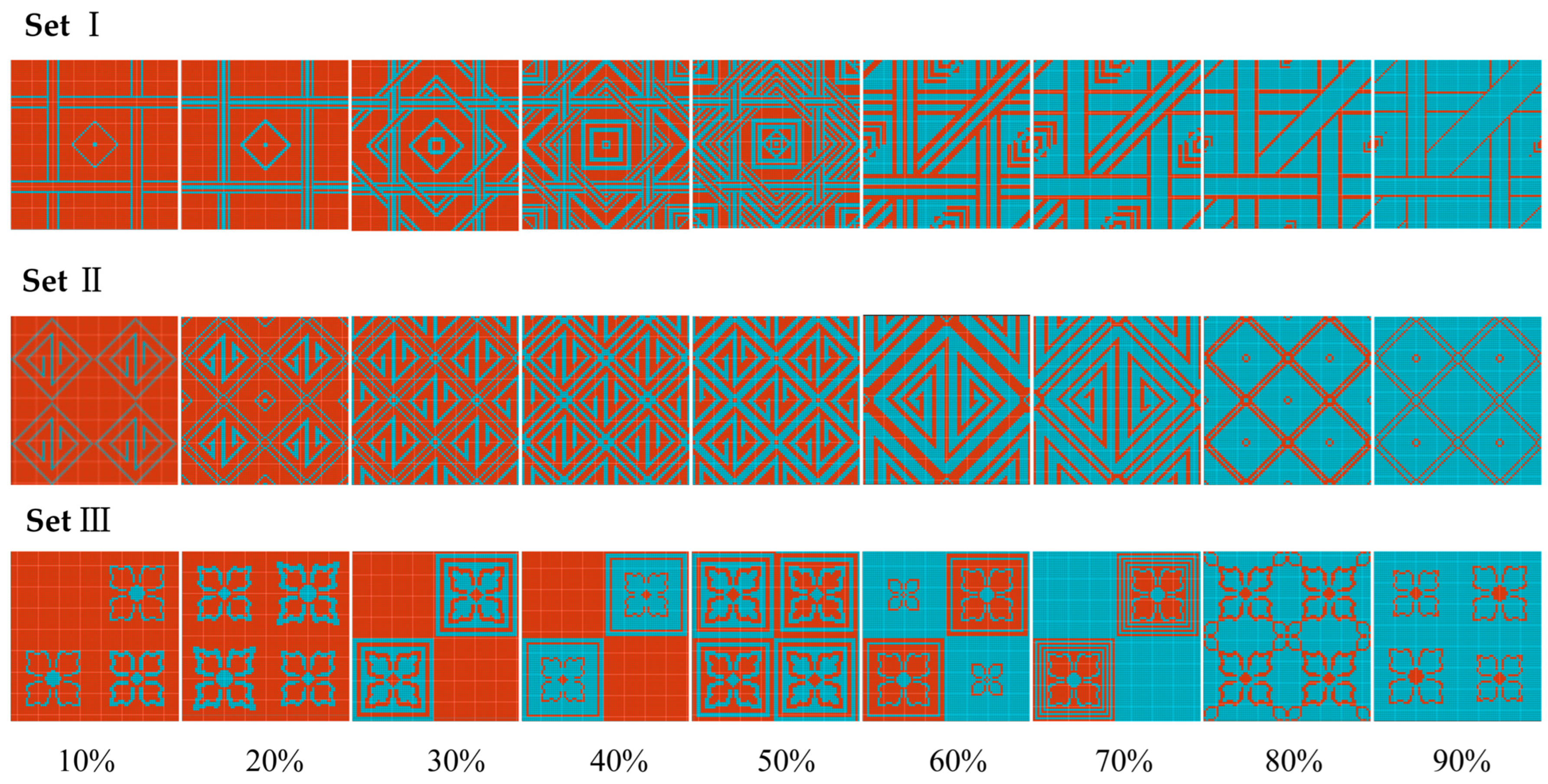 The indicators , and are physically related to the structural design of the Jacquard pattern, particularly the proportion of conductive yarn used in the fabric. Indicator represents the consumption of conductive yarn, which is directly associated with the color proportion in the Jacquard pattern; a larger pattern proportion corresponds to a higher amount of conductive yarn used in the fabric. Indicator represents the electrical resistance of the conductive fabric. As the proportion of conductive yarn in the pattern increases, the conductive pathway within the fabric becomes longer, leading to an increase in electrical resistance. Indicator represents the steady-state temperature of the fabric during the heating process, which reflects the overall thermal performance of the conductive knitted structure.