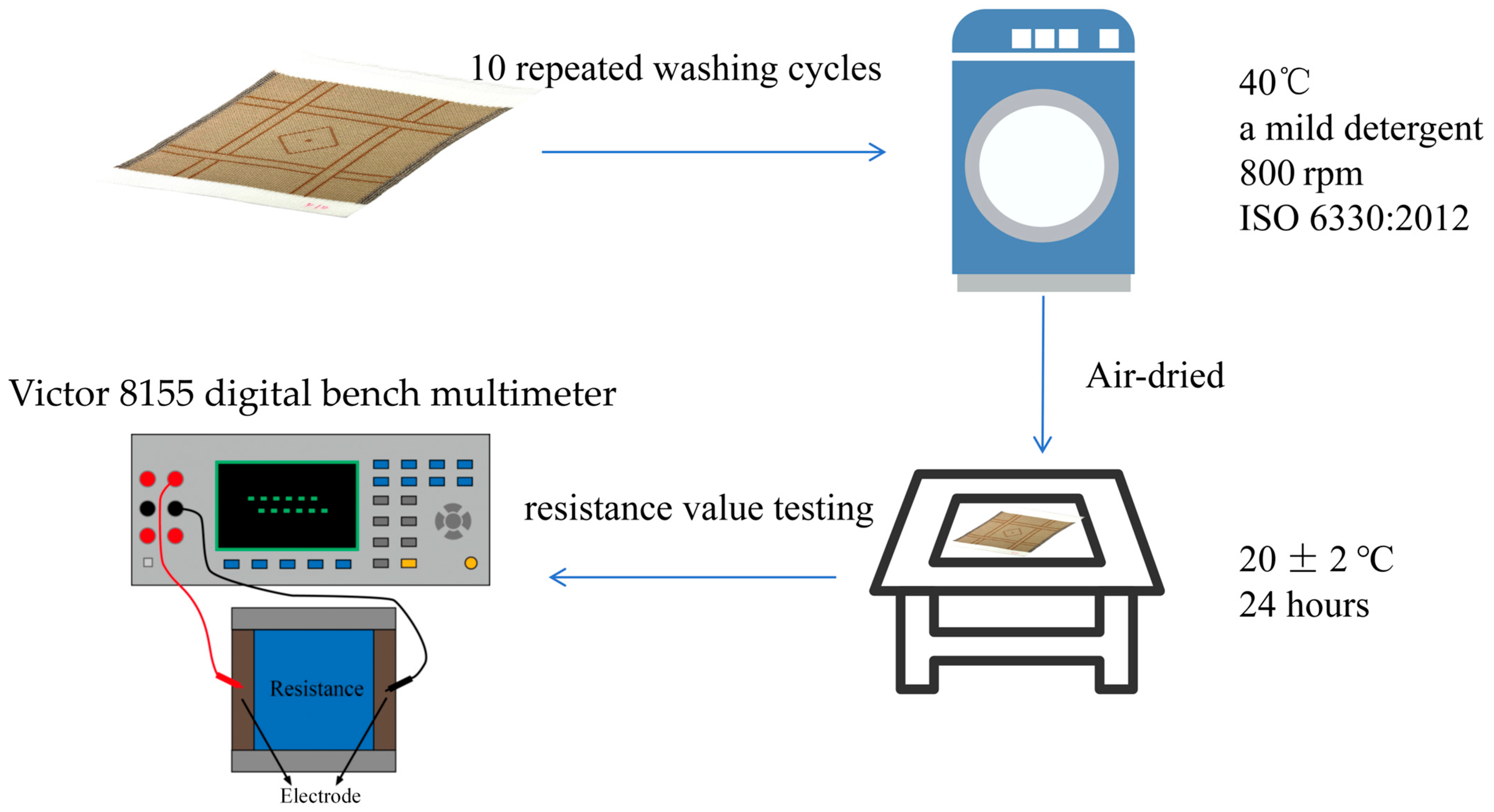 Despite the promising results obtained in this study, several limitations should be acknowledged. First, the number of samples investigated was relatively limited, which may restrict the statistical representativeness of the results. Second, the washing and heating performance evaluation was mainly based on resistance variation after washing and temperature rise under controlled laboratory conditions, while long-term durability and real wearing conditions were not investigated. In addition, the fuzzy comprehensive evaluation method relies on the selection of evaluation indicators and their corresponding weights, which may introduce a certain degree of subjectivity. Future studies could expand the sample size, incorporate additional performance indicators such as comfort and mechanical durability, and conduct long-term wear tests to further validate the applicability of the proposed conductive knitted fabrics.