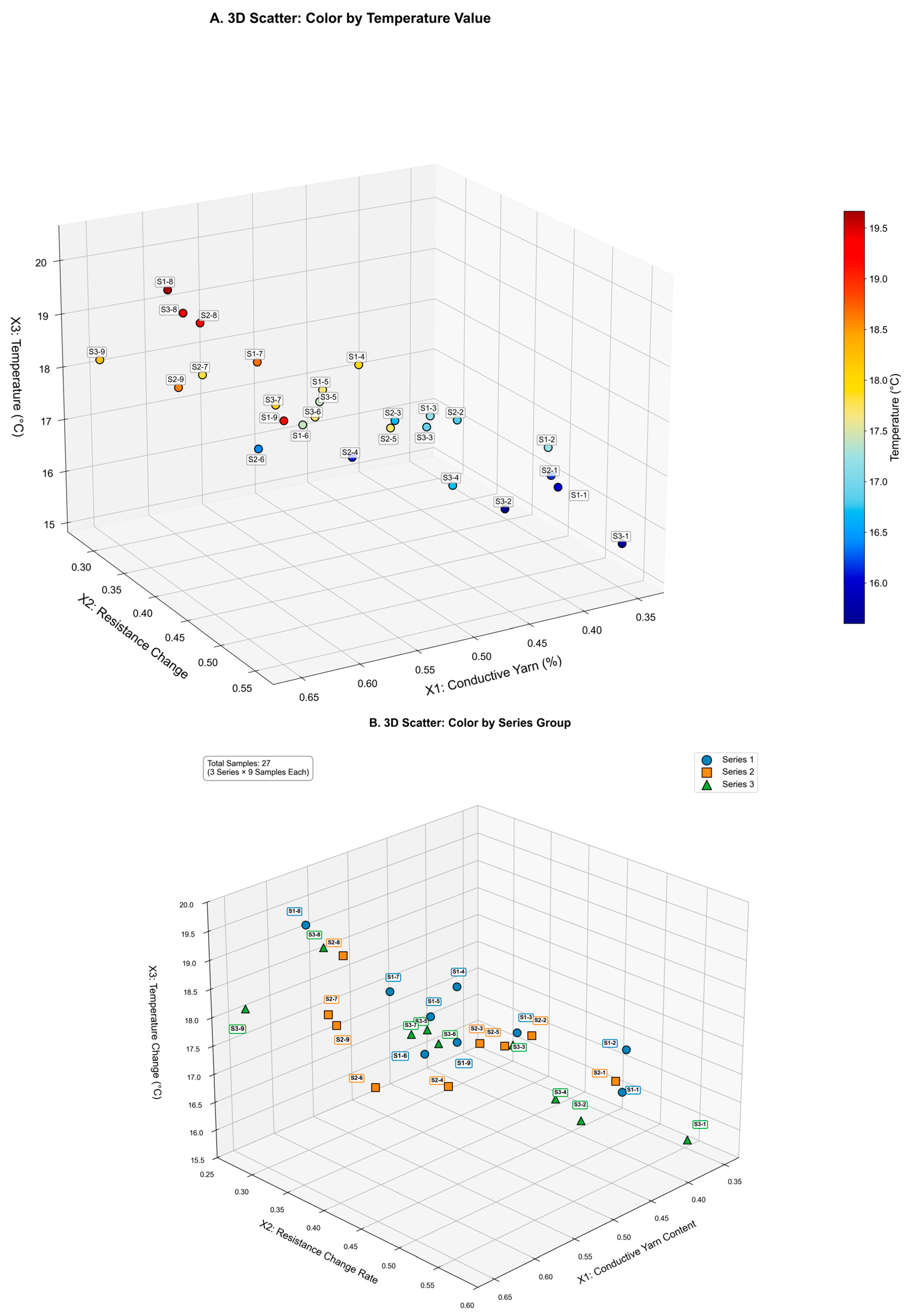 The 3D scatter plot further presents the actual distribution of the 27 samples in the