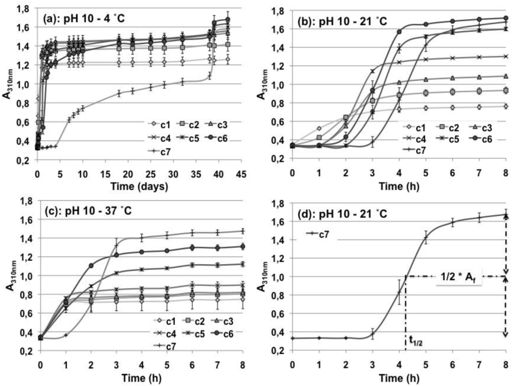 Results from the turbidity measurements as a function of pH (7, 10), ionic strength (c1, c2, c3, c4, c5, c6, c7) and temperature (T1 = 4 °C, T1* = 4 °C and 21 °C after 38 days, T2 = 21 °C, T3 = 37 °C): Final absorbance for all the types of gels and t1/2 for gels prepared at pH 10.