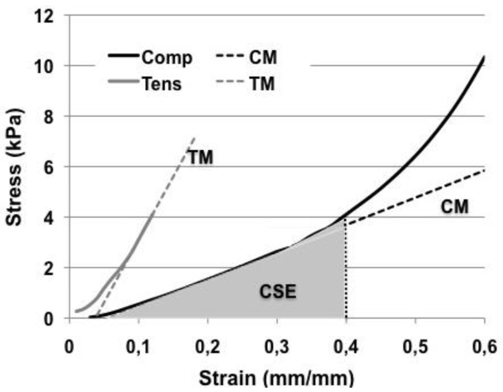 Mechanical behavior of collagen gels in terms of compression and tension with the slopes that were used to define the compressive modulus (CM) and tensile modulus (TM), respectively. The compressive strain energy (CSE) was defined as the integral between 0 and 40% of strain.