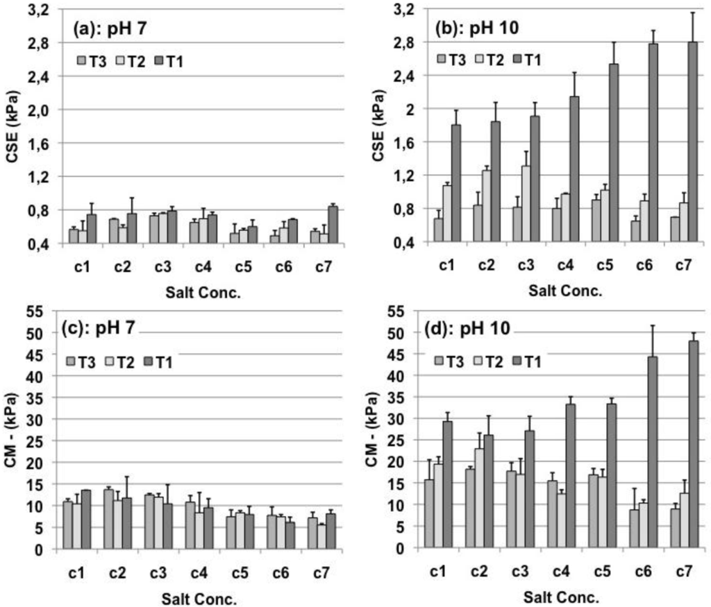 CM and CSE as a function of ionic strength (c1, c2, c3, c4, c5, c6, c7), pH (7, 10) and temperature (T1 = 4 °C, T2 = 21 °C, T3 = 37 °C) and expressed as mean ± SD.