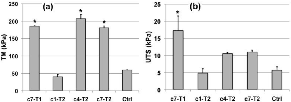 (a) Tensile modulus (TM) of the most representative gels: * denotes treatments with statistically significant differences as compared to the control (p < 0.01). (b) Ultimate tensile stress (UTS) of the most representative gels: * denotes treatments with statistically significant differences as compared to the control (p < 0.05).