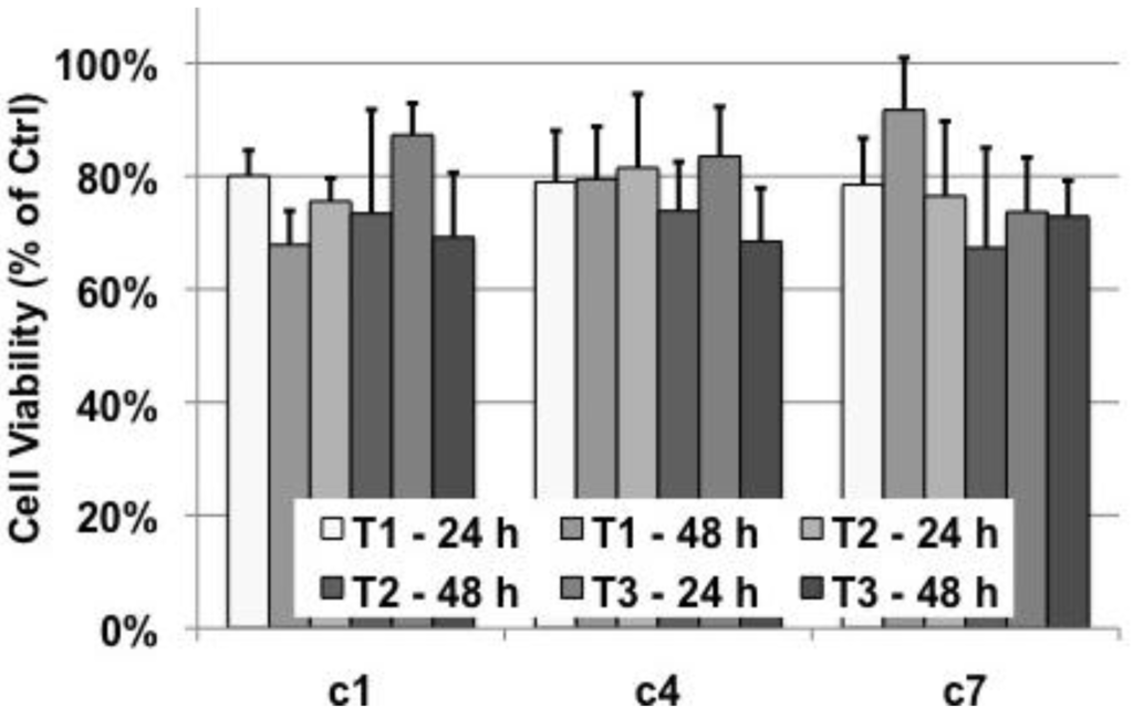 Collagen gels prepared at pH 10 and three different ionic strengths (c1, c4 or c7) were set in 48 multiwell plates at the three different temperatures. Each combination of ionic strength and temperature was repeated three times (n = 3). Samples were then soaked overnight in 1× PBS and then in culture medium (79% Dulbecco’s Modified Eagle Medium (DMEM High Glucose, HyClone Laboratories Inc., Logan, UT, U.S.), 10% Fetal Bovine Serum (FBS, Multicell Wisent Inc., Saint-Jean-Baptiste de Rouville, QC, Canada), 10% Porcine Serum (PS, Multicell Wisent Inc., Saint-Jean-Baptiste de Rouville, QC, Canada) and 1% Penicillin-Streptomycin (PenStrep, Invotrogen Corp., Carlsbad, CA, U.S.)). 3× E05 porcine smooth muscle cells (pSMCs) between the second and seventh passage were seeded on each sample and covered with culture medium. Samples were incubated and colorimetric assays were carried out after 24 or 48 h. 3-(4,5-dimethylthiazol-2-yl)-2,5-diphenyl-2H-tetrazolium bromide (MTT, Sigma Aldrich, St. Louis, MO, U.S.) is reduced to purple formazan by mitochondrial dehydrogenase in cells indicating normal cell metabolism. At each time point, culture medium was removed and each sample was rinsed with PBS in order to remove dead cells. MTT was solubilized in culture medium (1 mg/mL) and added to cells; samples were subsequently incubated for 4 h. The medium was then removed, samples were extensively rinsed with 1× PBS and dried overnight in a vacuum oven at 21 °C; the purple formazan crystals were solubilized with pure dimethyl sulfoxide (DMSO, Sigma Aldrich, St. Louis, MO, U.S.) at room temperature. The optical density at 595 nm was determined using a 96-well plate reader (BioRad Model 450 Microplate Reader, Mississauga, ON, Canada). Cell viability was expressed as % of the control, corresponding in this case to the collagen gel previously developed and whose biological properties have already been assessed [7]. Even though this gel presented a lower concentration of collagen (2 mg/mL) because of the presence of serum and culture medium, it was considered the best choice as a positive control in order to evaluate the potential of the new gels in terms of biological performances.