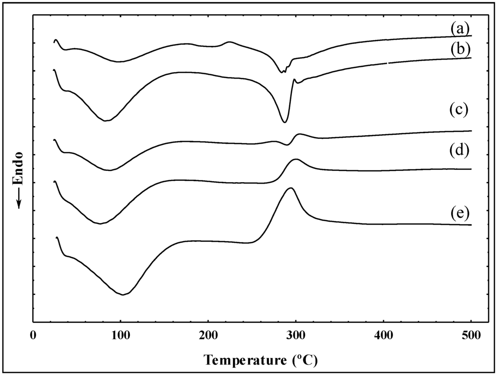 Pure CHI film [Figure 3(e)] presented a characteristic exothermic peak at 294 °C. This peak is attributed to a complex process including dehydration of the saccharide rings, depolymerization and decomposition of the acetylated and deacetylated units of polymer [16].
