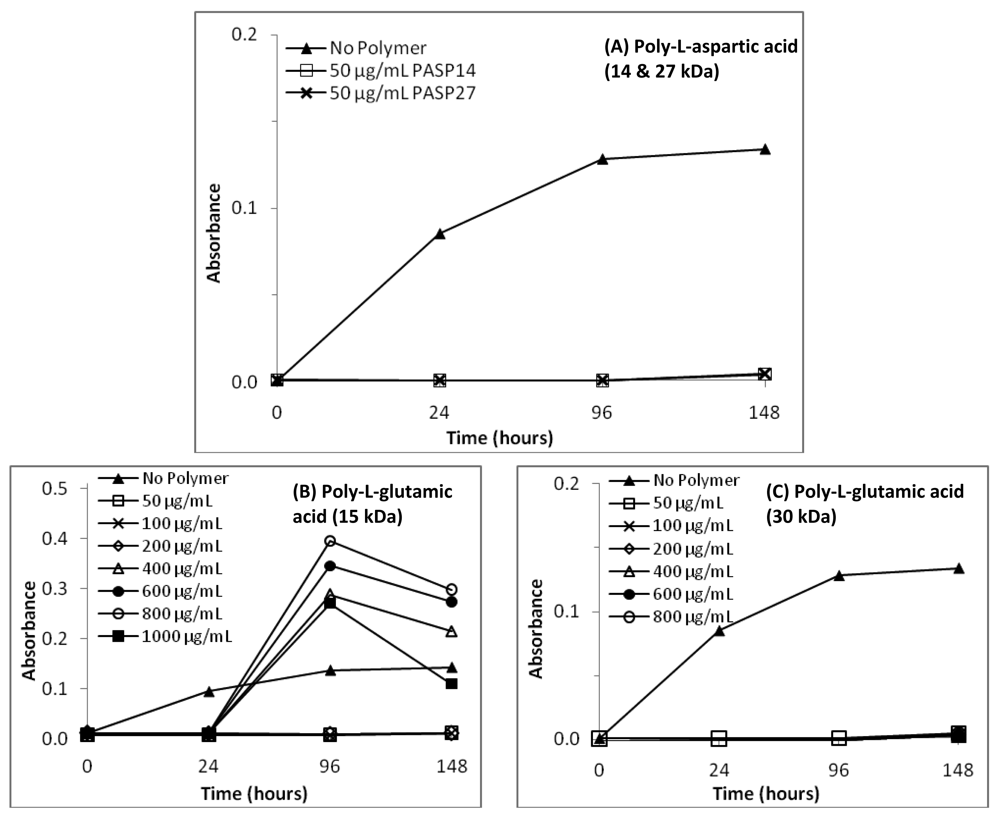 Figures 1(B) and 1(C) show the optical density of solutions containing 15- and 30-kDa polyglutamic acid, respectively. When a concentration range of 50 to 1,000 μg/mL of polyglutamic acid was analyzed, turbidity measurements for the 15-kDa PGLU were lower than the negative control at concentrations below 200 μg/mL. Conversely, turbidity results for the other four 15-kDa GLU concentrations (400, 600, 800 and 1,000 μg/mL) were all higher than that of the control, implying that the role of polyglutamic acid (Mw 15 kDa) as a promoter or inhibitor of mineral precipitation depends on its concentration. In the case of the higher molecular weight polyglutamic acid (30 kDa), turbidity measurements for all concentrations were lower than that of the negative control, suggesting that 30-kDa PGLU is effective at inhibiting mineral precipitation. Optical density profiles of solutions containing combinations of PASP and PGLU at 1:1 ratio were also analyzed, and exhibited turbidity measurements below the negative control (data not shown).