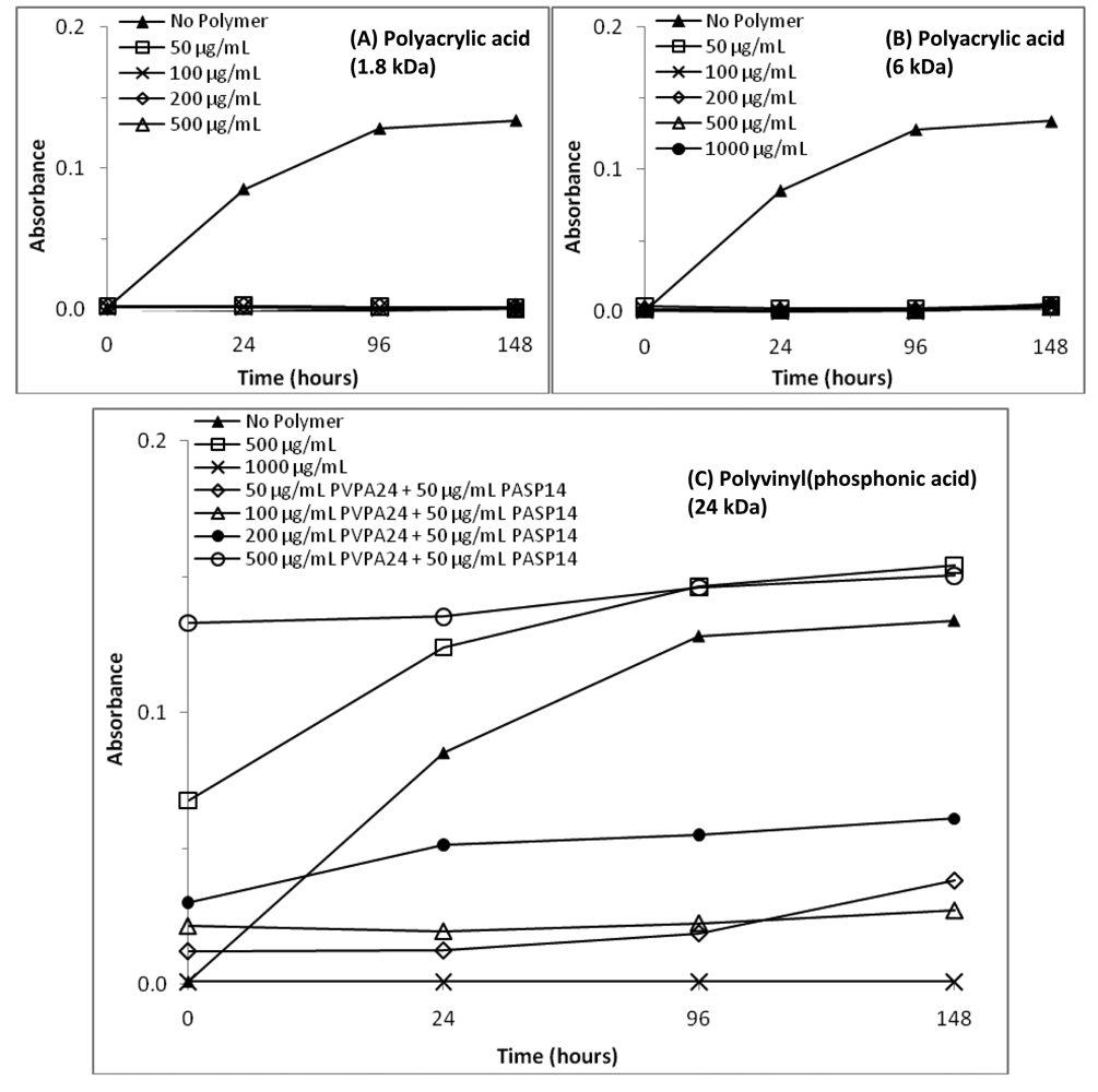 Figures 2(A) and 2(B) show the optical density profiles for the polyacrylic-acid-containing solutions. As can be seen from the data, all the turbidity measurements for the 1.8- and 6-kDa PAA were lower than that of the negative control. All PAA-containing solutions remained stable, non-precipitated for the seven-day period study. The optical density measurements for the PVPA solutions are displayed in Figure 2(C), showing that only solutions containing PVPA at 1,000 μg/mL resulted in no precipitation over seven days. The combination of PVPA and PASP acid did not seem to decrease turbidity of the solutions, suggesting that the stabilizing role of PASP is hindered by the presence of PVPA.