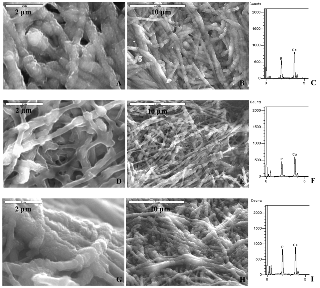 From previous studies [], we correlate the fibrillar structure to a more advanced degree mineralization, and the nodular structure to a lower mineral content. At the initial stages of mineralization, collagen fibrils are not fully mineralized and the observed nodules represent the areas within the fibril where mineral is present. Mineral infiltrating the collagen fibril displaces water within the fibril. When samples are dehydrated for SEM examination, the fibril areas infiltrated by the mineral maintain their shape while areas with no mineral collapse, giving the sample a nodular appearance. Once the collagen substrate reaches a high mineral content, mineral penetration throughout the fibril is more homogeneous. When fibrils are fully mineralized, they maintain their shape after dehydration and the nodular structure is no longer observed. In addition, samples from the exterior of the scaffold appeared to have a rough texture, indicating that mineralization might be occurring on the outside of the fibrils as well. These differences in morphology illustrate the progressive intra- and inter-fibrillar mineralization of the samples, where inter-fibrillar mineralization often occurs after the fibrils have become well infiltrated with mineral []. EDS data, shown in Figures 3(C) and 3(F), corroborate the observations made from the morphology analysis. Calcium and phosphorous signals were present on the surface of the scaffolds as well as on the inside, but a lower signal intensity of the elements was observed on the inside of the sponge. When more time was allowed for the collagen sponge to become mineralized (6 days), no differences were observed between the surface and the inner regions of the mineralized scaffold (Figures 3(G–I) show the inner region).