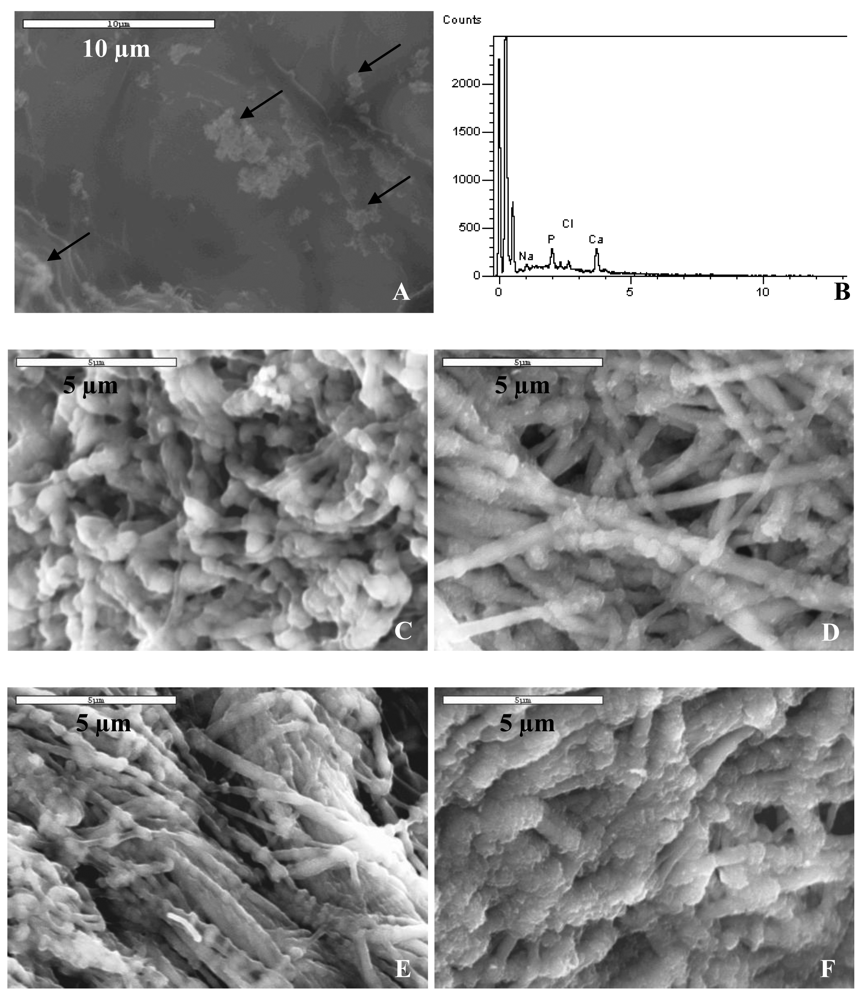 The morphology and elemental composition of each of the mineralized collagen scaffolds was characterized using scanning electron microscopy (SEM) and energy dispersive spectroscopy (EDS). Figure 3 shows scanning electron micrographs (SEM) of the sponge mineralized with polyaspartate (14 kDa) to induce the PILP process. The mineralized collagen took on a distinctly different appearance, with physical changes evident even at the macroscopic level. Differences could be seen in the color and rigidity of the sponges, which became white and stiff (while still in solution) as they mineralized. Microscopically, mineralized collagen sponges showed a fibrillar morphology which was very different than the amorphous, gel-like topography of untreated specimens (Figure 4(A)). Mineralized collagen samples developed a pronounced fibrous and rough texture (Figures 3(A) and 3(B)) with no evidence of surface deposits of mineral clusters, as seen in the control reaction (Figure 4(B)). It is interesting to note that something about the mineralization reaction brings out the fibrous texture of the collagen. One possible explanation is that the amorphous gelatinous constituents might dissolve during the time for mineralization. Alternatively, something about the PILP reaction media may cause further fibrillogenesis. The second explanation is supported by the observation that the fibrils have quite large diameters, ranging from a couple hundred nanometers to micron size. This seems to suggest that the PILP media has caused further assembly of multiple collagen fibrils. Figures 3(D) and 3(E) show the inner region of the collagen sponge after three days of reaction. The interior of the sponge (which is 3 mm thick) was obtained by the freeze-fracture technique. The interior of the sponge exhibited a fibrillar and nodular morphology looking slightly different than the topology of the surface.