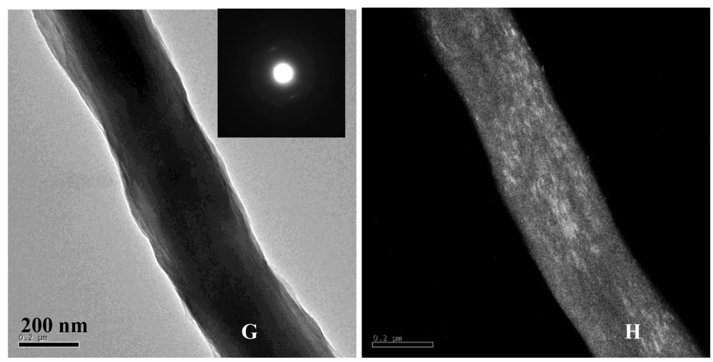 Figures 6(C–F) show SEM images of the inner-sections of PILP-mineralized collagen samples using combinations of poly-L-aspartic and poly-L-glutamic acid as the process-directing agents. The images are all taken from the inside of the samples to demonstrate that the mineralization was not only near the surface of the scaffold, but penetrated the entire thickness of the sample. The mineralized collagen sponges treated with PGLU-PASP presented a morphology similar to the samples treated with the high molecular weight PASP, where a fibrillar structure was observed with no difference between the inside and outside (not shown) of the sample. In addition, several of the samples appeared to have a rough surface indicating that mineralization might be occurring on the outside of the fibrils as well. The EDS spectrums for PGLU-PASP treated samples showed strong calcium and phosphorous peaks, which are consistent with the high degree of mineralization (data not shown). Figures 6(G) and 6(H) show TEM bright- and dark-field images of a mineralized collagen fibril treated with the PGLU-PASP combination. As in the case of fibrils mineralized with PASP alone, the high z-contrast observed in the TEM image could be attributed to the presence of hydroxyapatite crystals embedded within the collagen fibril. Also, the SAED pattern of the mineralized fibril (Figure 6(G), inset) shows an orientation of the HA crystals very similar to bone′s, which are illuminated in the dark-field image.