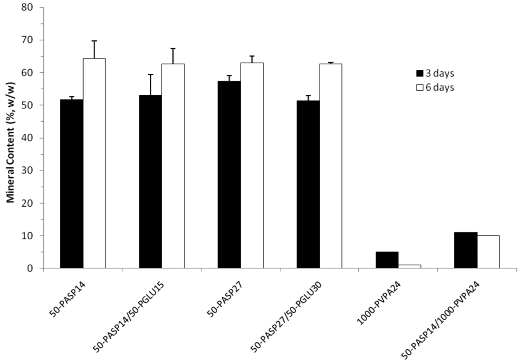 Following examination of the hydroxyapatite mineral using WAXD, the amount of mineral was determined using thermogravimetric analysis (TGA). Figure 9 shows a drastic difference in mineral content between the samples mineralized using PASP alone or the PASP-PGLU combination, both of which had approximately 50% (w/w) mineral after 3 days, compared to the PVPA and PAA samples with 5 and 0% mineral (not shown), respectively. After six days of mineralization, the PASP and PASP-PGLU samples exhibited very high mineral content at around 60 to 65% (w/w) mineral, but there was not a distinguishable difference between the mineralization using polyaspartic acid alone compared to polyaspartic in combination with polyglutamic acid. The mineral content increase could be correlated to the mineralization progression through to the inner regions of the scaffold, as observed in the SEM images described earlier. We presume the increased mineralization relies on the time it takes for the amorphous precursor nano-droplets to diffuse through solution before they can reach the collagen scaffold and then absorb into the collagen fibrils.