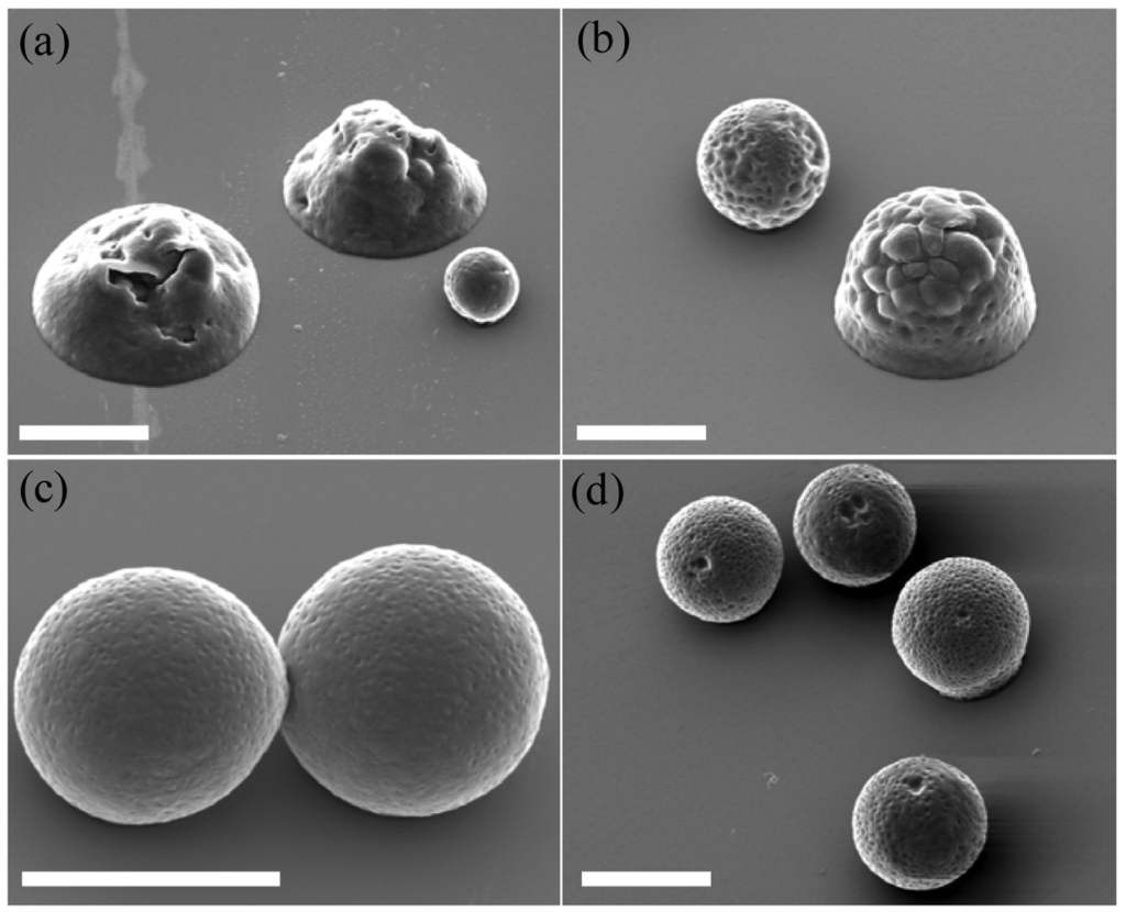 Reproducibility of electrosprayed particles is a problem when working in the semidilute unentangled regime as the possibility of a distribution of polymer chains in the droplets could generate higher local concentrations in some droplets. This explains why some spherical particles are still shown from low concentration solutions, as seen in Figure 2(a) and (b). In order to obtain reproducible, homogeneous, and solid particles, it is necessary to ensure complete solvent removal and to use polymer concentrations above cent. This is equally important for producing spherical particles as it was shown that if the evaporating droplets present a sufficiently entangled network before they reach the Rayleigh limit, the resulting particles will remain monodispere and spherical, as the entangled network stabilizes the droplet against rupture, reducing the frequency of smaller offspring particles being emitted [28]. There are some scaling laws to determine cent for each type of polymer solution, however it is most likely to be determined experimentally. In the case of PCL 50 kDa dissolved in chloroform, it can be deducted from this study that cent is comprised between 7.5 and 10 %w/v, where 10 %w/v was sufficient to produce solid particles on the collector, ensuring homogeneity and sphericity of particles.