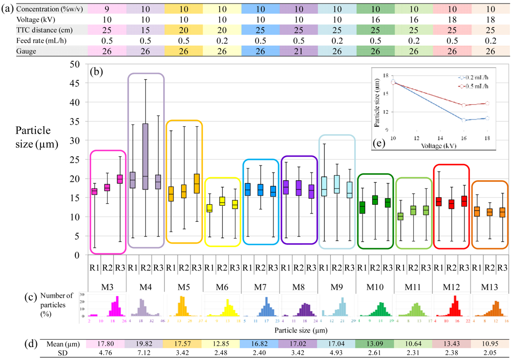 The microspheres produced for conditions 3 and 5–13 had narrow quasi-monodisperse size distributions with average diameters ranging from 10.64 to 17.80 μm (standard deviations (SD) ranging from 2.05 to 4.93) (Figure 4). Electrospraying was shown to be reproducible for most conditions, with average particle sizes always comprised within a 3 μm difference. A short tip-to-collector (TTC) distance, however, did not ensure reproducibility with 15 cm being too close (condition 4). Distances of 20 cm and 25 cm led to better reproducibility, with a trend showing a slightly narrower size distribution when using a slower feed rate (0.2 mL/h instead of 0.5 mL/h), as shown by standard deviations from Figure 4(d).
