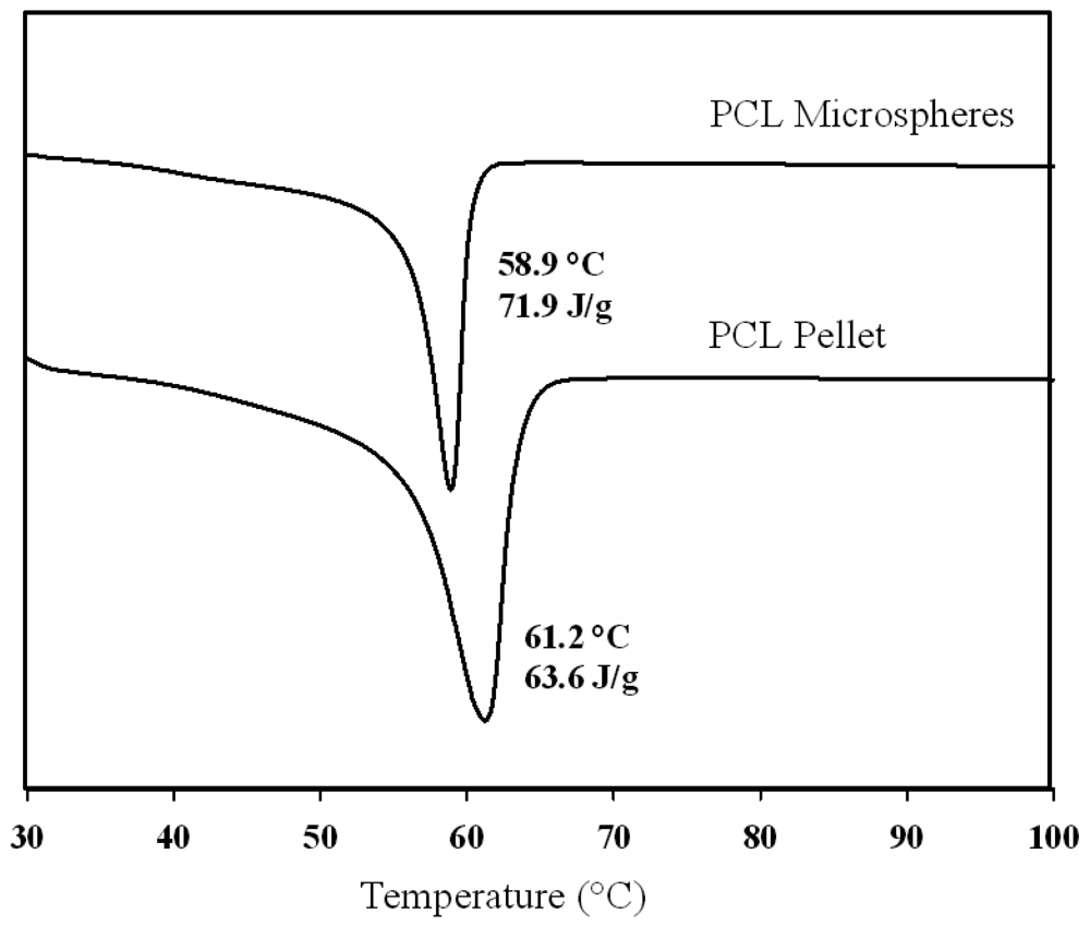 DSC results, presented in Figure 5, show single melting peaks with a maximum melting temperature (Tm) of unprocessed PCL of 61.2 °C and a heat of melting (Hm) of 63.6 J/g, while Tm = 58.9 °C and Hm = 71.9 J/g for electrosprayed microspheres, translating respectively to 45.6% and 51.5% crystallinity (based on Hm for 100% crystalline PCL of 139.5 J/g [41]). Tm is shown to be slightly decreased, inferring that smaller crystallites are formed during electrospraying. The degree of crystallinity of PCL after the second run, with the thermal history removed was shown to be 35.0% and 38.3% for unprocessed PCL and electrosprayed beads, respectively. These non-significant values confirm that no intrinsic changes were made to the polymer that went into contact with chloroform, and further electrosprayed. The use of chloroform to dissolve PCL can therefore be validated as an appropriate solvent for electrospraying PCL solutions.