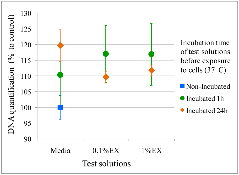 A direct contact assay from the same ISO 10993-12 was also performed to ensure that microspheres were physically compatible with cells. The microspheres were rinsed or left non-rinsed in media for different incubation times so that the effect of different conditions and times on cell viability could be assessed. Different concentrations of microspheres were used: 0.01% and 0.1 %w/v. It must be noted that such densities were extremely high relative to cell numbers and the study of cell morphology after contact with microspheres was not possible with microscopy since immersed microspheres would settle down on cells and completely cover them. However, after removal of microspheres, cell DNA contents were not lower than the controls for any of the condition tested and combinations (rinsed microspheres, non-rinsed microspheres, 1h incubation, 24 h incubation), showing that microspheres did not have any physical adverse effects on cells (Figure 7), as determined by a two-way ANOVA analysis (p > 0.05).