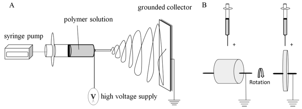 A general procedure can be described for fabricating nonwoven, electrospun fibrous scaffolds [13]. The electrospinning process consists of a high voltage power source, syringe pump, syringe, needle, and a grounded collection device (Figure 1(A)). A polymer solution is loaded into the syringe having an attached needle. A high voltage is applied to the polymer solution as it is ejected at a desired flow rate (controlled by the syringe pump). When a high voltage is injected into the polymer solution, an electrostatic force overcomes the surface tension of the polymer solution at the tip of the needle and a Taylor cone is formed, which is further elongated into a fluid jet. The charged fluid jet is collected on a grounded device due to the electrical potential difference between the polymer solution at the tip of the syringe and the grounded collecting device. The whipping motion of the polymer jet that takes place between the needle and the plate allows for the solvent to evaporate, which results in the collection of a polymer fiber mesh on the collection plate. The resulting mesh consists of nonwoven, random fibers that can vary in diameter from the nano to micron-scale depending upon the processing parameters used.