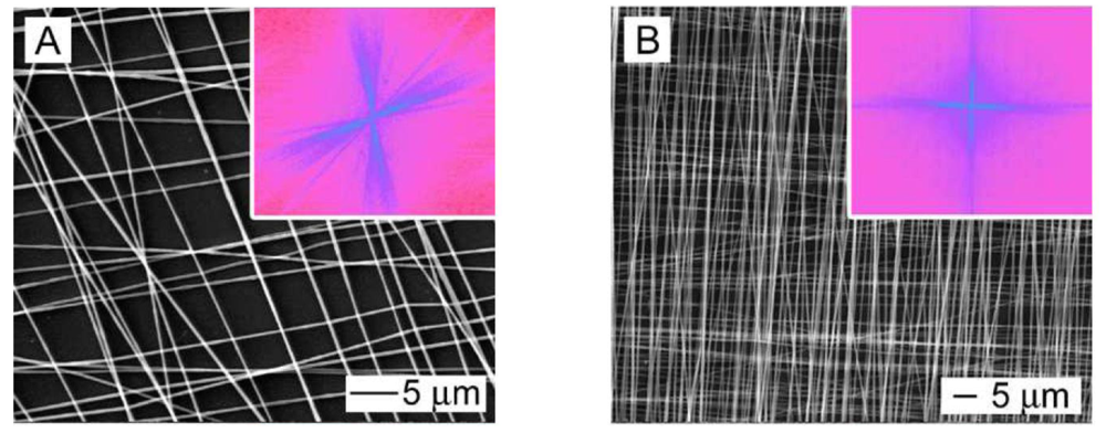 Aligned fibrous meshes (Figure 2) can be achieved by varying the collection method. The most common methods are collecting on a high speed rotating drum or disk [15] (Figure 1(B)). This allows for the fiber to collect along the direction of rotation. Small diameter tubes can also be fabricated by this method and have been used in vascular repair studies [16]. A high rotation speed produces increased fiber alignment as compared to lower rotation speed, but may cause fiber discontinuity [15,17].