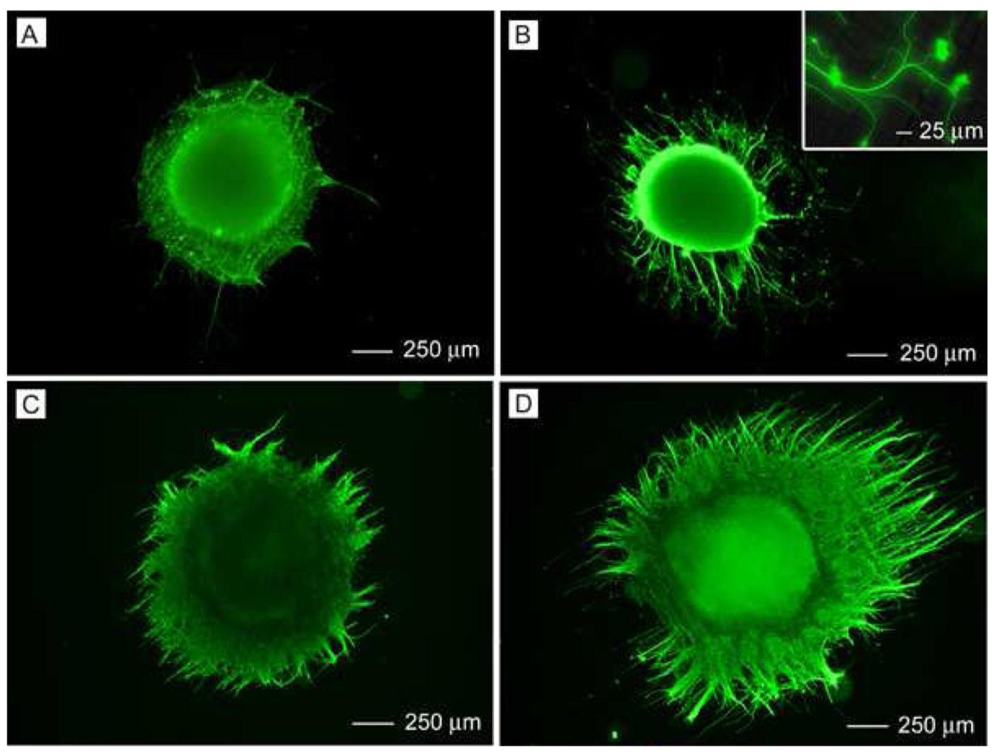 Fiber diameter can also influence cell adhesion, proliferation, migration, and differentiation. Yang et al. demonstrated electrospun nano-sized fibers (300 nm) of PLLA enhanced neural differentiation of neonatal mouse cerebellum C17.2 stem cells as compared to micron-sized (1.25 μm) fibers [26]. The cells elongated and oriented neurites along the direction of the aligned fibers. In addition, cells on nano-aligned fibers had the longest neurite extension as compared to micron-aligned fibrous matrices and all random mats. Rat hippocampal-derived neural stem cells were shown to differentiate into more oligodendrocytes and neurons on laminin-coated electrospun polyethersulfone fibrous scaffolds having 283 nm and 749 nm fiber diameters, respectively, as compared to tissue culture polystyrene [27]. Nano-sized fibers promoted higher proliferation and cell spreading and less cell aggregation in comparison to micron-sized fibers. Both stem cell studies indicate that contact guidance cues provided by the nanofiber plays an important role in regulating differentiation and proliferation. For neuronal cell phenotypes, fiber diameter appeared to play a lesser role. PC12 neurite extension on aligned PCL fibers with diameters of 3.7 ± 0.5 μm and 5 ± 0.9 μm were significantly longer than on non-aligned fibers with a diameter of 4.4 ± 0.5 μm and neurites extended parallel to the aligned fibers for all fiber diameters studied [28]. No differences in neurite extension were detected between the aligned fiber meshes having different fiber diameters. The authors of this study also developed a novel electrospinning technique to fabricate a nerve conduit with an outer layer of random and an inner layer of aligned PCL fibers with the goal of the inner layer providing structural guidance cues for nerve growth. Axon formation and length of rat embryonic hippocampal neurons has been shown to be independent of fiber diameter for poly-D-lysine coated PLGA mats [29]. However, neurite polarization was slightly greater on submicron fibers and aligned fibers suggesting the degree of fiber alignment to be the key factor in axon formation and elongation [29].
