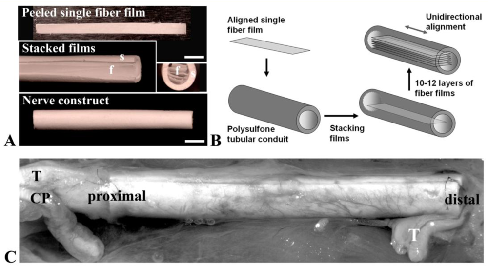The scaffolds were immobilized with or without rolipram. Rolipram is an anti-inflammatory drug that increases neuroprotection after SCI. The scaffolds with rolipram had the least glial scarring and an improved hindlimb locomotion as compared to untreated or scaffold alone [34]. Polysulfone nerve conduit (Koch Membrane Systems) filled with either (1) saline, (2) aligned, or (3) random poly(acrylonitrile-co-methylacrylate) (PAN-MA) fibrous mats were used as a rat tibial nerve bridge (Figure 5) [35]. The aligned construct improved functional outcome significantly in a 17 mm nerve defect as compared to the random construct suggesting the important role of topography in neural regeneration. Aligned and random electrospun PCL scaffolds were implanted into the caudate putamen of the adult rat brain [36]. The fiber alignment influenced the neurite infiltration and had a minimal inflammatory response. Therefore, studies using three-dimensional constructs containing aligned fibers are showing promise for various neural applications.
