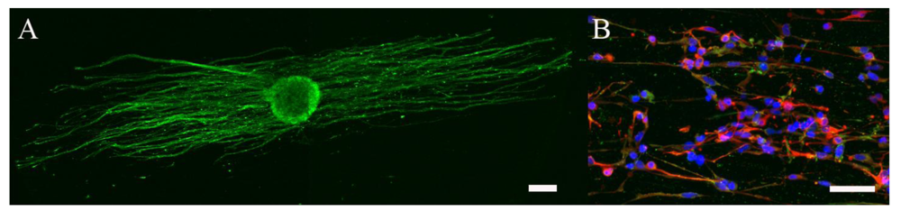 Piezoelectric polymers are also being sought for electrospun mats because they can induce a transient change in surface charge without requiring additional energy sources or electrodes and have been shown to yield a higher level of neuronal differentiation and neurite outgrowth of mouse neuroblastoma cells [55]. The piezoelectric phenomenon is closely related to the change of dipole crystal orientation when a force is applied. The dipole structures in a piezoelectric material are organized and no net charge is produced at rest. When a mechanical force is applied, the shifting or rotation of the dipole crystal results in the change of polarization density, hence, causing the transient change of electric charge. Upon the removal of mechanical force, the dipole crystal returns to its original space. Polyvinylidene fluoride (PVDF) and polyvinylidene fluoride- trifluoroethylene (PVDF-TrFE) are semi-crystalline polymers where the former becomes piezoelectric if it is in an all-trans oriented dipole configuration [56]. Electrospinning PVDF solutions induces the piezoelectric properties [57]. The piezoelectric properties of PVDF-TrFE are not altered by the electrospinning process [58]. DRGs and human NPSCs have been shown to extend neurites along aligned PVDF-TrFE scaffolds (Figure 6). The piezoelectric property may be induced in these fibers in vitro and in vivo via minute deformations of the fibers due to cell attachment and migration, which has been shown in other non-neural cell types on collagen fiber matrices [59]. Piezoelectric activity in these fibers may also be activated in vivo due to bulk deformations from the cerebrospinal fluid circulation or in the PNS, in response to changes in neighboring anatomic structures.