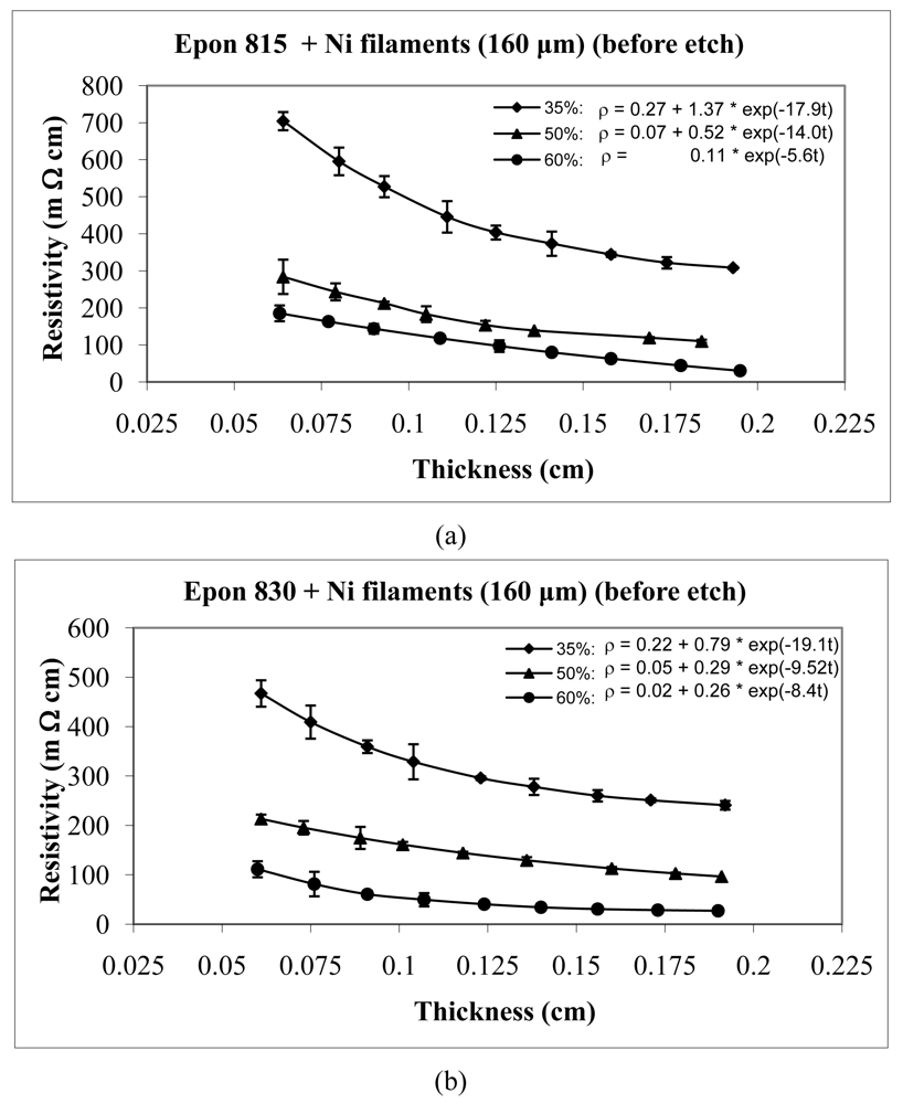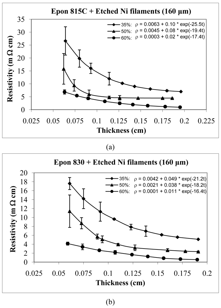 For the same amount of 160 μm filaments loading, the resistivity level is less with the Epon 830 resin than the Epon 815C resin. Comparison of Figure 10(a) and 10(b) reveals 43% reduction in parameter a, 50% reduction in parameter b, and 9% reduction in parameter c, when the higher viscosity resin is used with etched 160 μm nickel filaments. With the unetched nickel filaments, (Figure 9(a,b)), the parameters a and b decrease 24% and 43%, respectively, when the viscosity of the resin is increased.