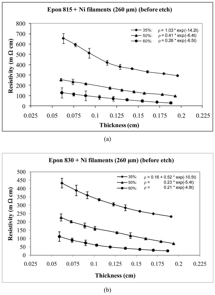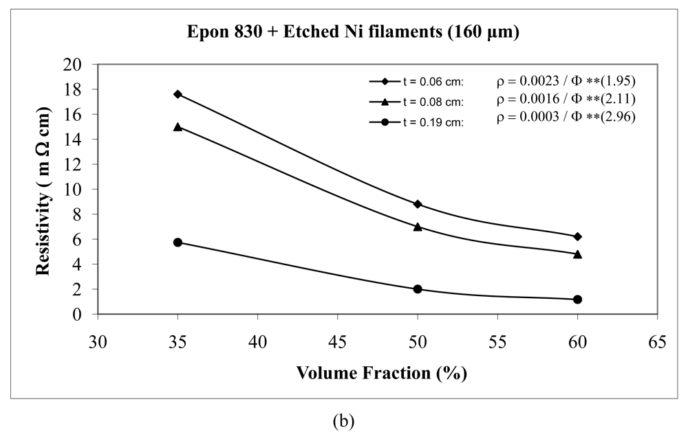 At equal concentration, the unetched nickel filaments produce higher resistivity compare to the etched filaments. For the nickel filaments of 160 μm length, the values of the parameter A with the etched particles dropped dramatically by as much as 94% (t = 0.19 cm) for the Epon 815C system (Figures 18(a) and 19(a), and Table 3), and 97% (t = 0.19 cm) for the Epon 830 system (Figures 18(b) and 19(b), and Table 4). The values of the exponent n decreased by as much as 30% (t = 0.19 cm) with the Epon 815C system (Figures 18(a) and 19(a), and Table 3), and 7% (t = 0.14 cm) with the Epon 830 system (Figures 18(b) and 19(b), and Table 4), when etched particles were used. For the nickel filaments of 260 μm length, the values of the parameter A with the etched particles dropped dramatically by as much as 93% (t = 0.19 cm) for the Epon 815C system (Figures 20(a) and 21(a), and Table 3), and 97% (t = 0.19 cm) for the Epon 830 system (Figures 20(b) and 21(b), and Table 4). The values of the exponent n decreased by as much as 32% (t = 0.19 cm) with the Epon 815C system (Figures 20(a) and 21(a), and Table 3), and 13% (t = 0.14 cm) with the Epon 830 system (Figures 20(b) and 21(b), and Table 4), when etched particles were used.
