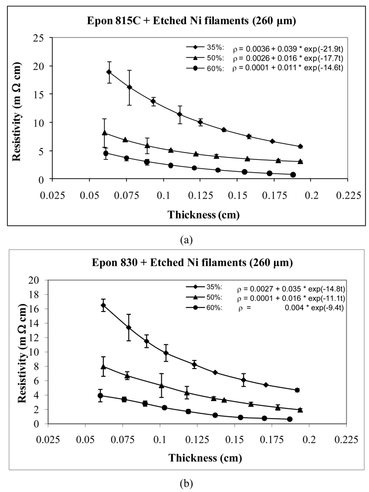 Comparing Epon 830 resin with 815C, for the same thickness of adhesive film, the 260 μm nickel filaments approximately follow the same trend as nickel flakes, nickel powder, and silver powder. The parameter A has lower values with Epon 815C resin than Epon 830 resin. The average difference is as much as 17% with unetched filaments, and 4% with etched filaments. On the other hand, Epon 815C has higher values for exponent n in comparison to Epon 830. The average difference is as much as 16% with unetched filaments, and 6% with etched filaments. As for 160 μm nickel filaments, the results display a mixed trend. Going from Epon resin 815C to 830, the values of parameter A increase by as much as 22% (average), and exponent n increase by as much as 4% (average) with the unetched filaments. For the etched 160 μm Ni filaments, again going from Epon 815C to 830, the values of parameter A increase by as much as 45% (t = 0.08 cm), and the values of exponent n decrease by 13% (t = 0.19 cm).