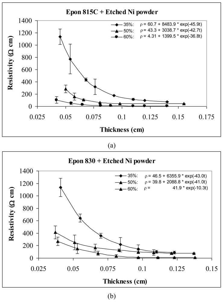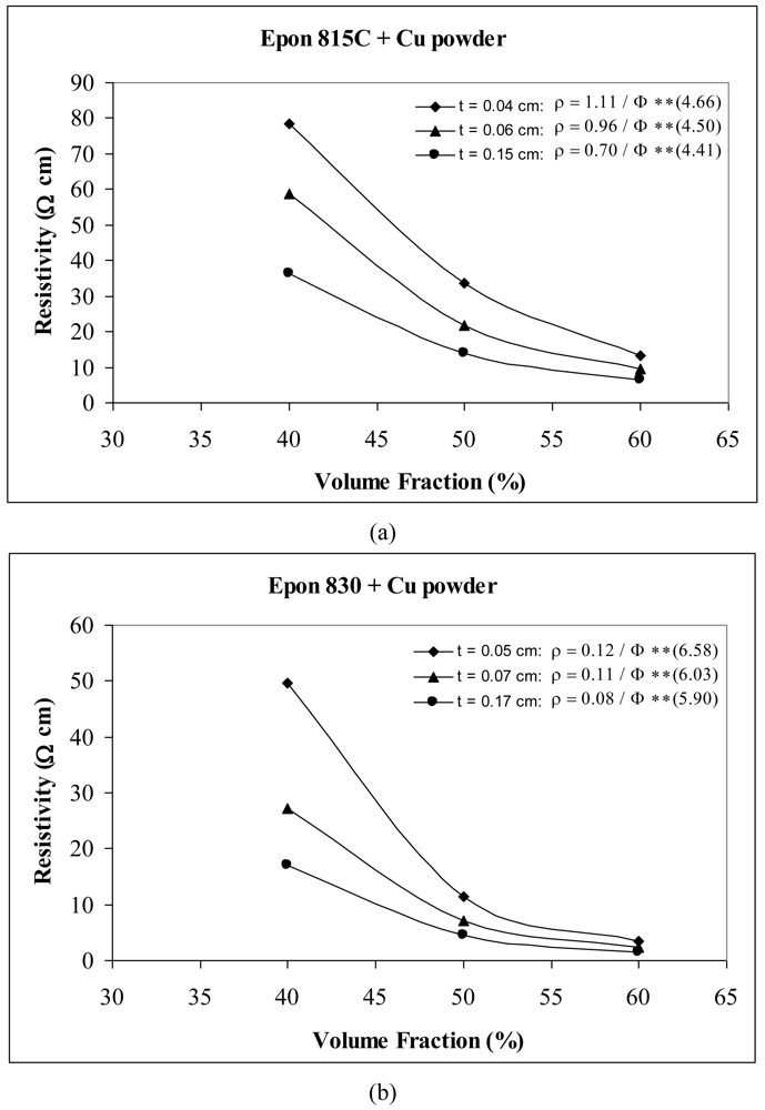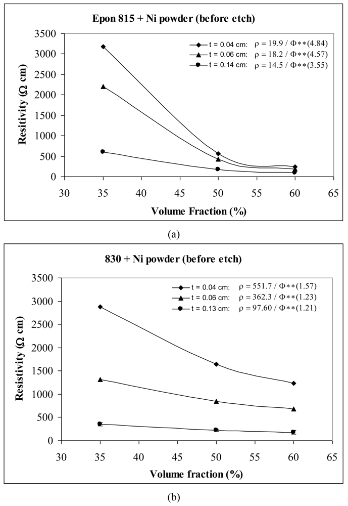 Volume fraction-thickness dependent resistivity behaviors of etched nickel flake filled conductive adhesive films of three different thicknesses are shown in Figure 13. We note that the values of parameters A and n both decrease with increasing thickness of adhesive film, indicating reductions in film resistivity. This is because thicker conductive adhesive films have more possibility of particle network interconnection formation, resulting in easier electrical conduction through the composite film. For example, with Epon 815C resin, increasing the film thickness from 0.04 cm to 0.06 cm, results in 20% and 5% decreases in A and n values, respectively, and a further increase to 0.14 cm, results in 47% and 8% reductions, respectively (Figure 13(a)). The corresponding reductions are 3%, 10%, and 33%, 18% when Epon 830 resin is used (Figure 13(b)).