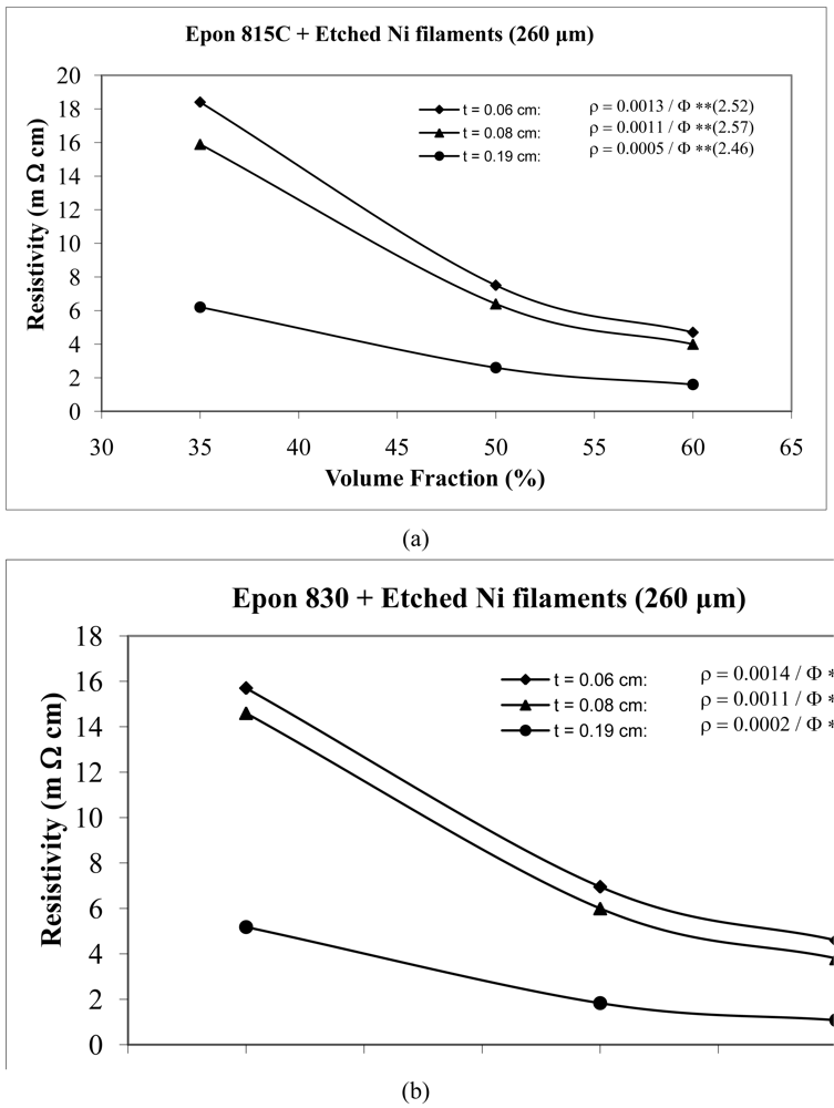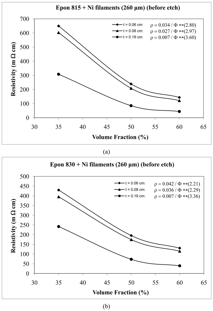 For the same amount of 260 μm filaments loading, the resistivity level is less with the Epon 830 resin in comparison to the Epon 815C resin. Comparison of Figure 12(a) and 12(b) reveals 61% reduction in parameter a, 25% reduction in parameter b, and 35% reduction in parameter c, when the higher viscosity resin (Epon 830) is used with etched nickel filaments. With the unetched nickel filaments, (Figure 11(a,b)), the parameter a remains zero, parameter b decreases 52% and parameter c decreases 27%, when the viscosity of the resin is increased.