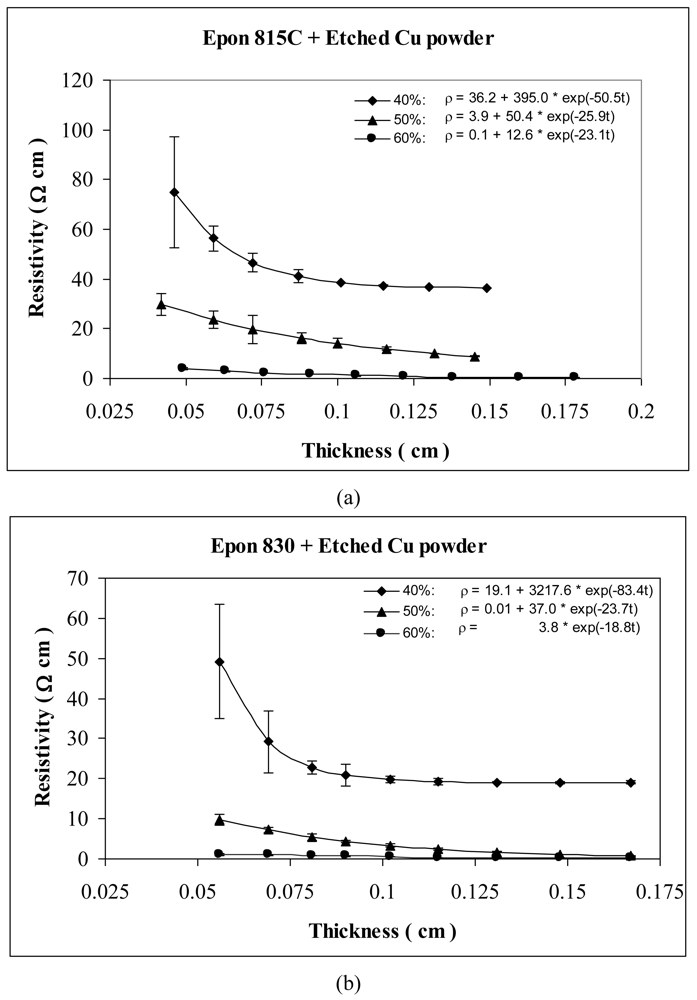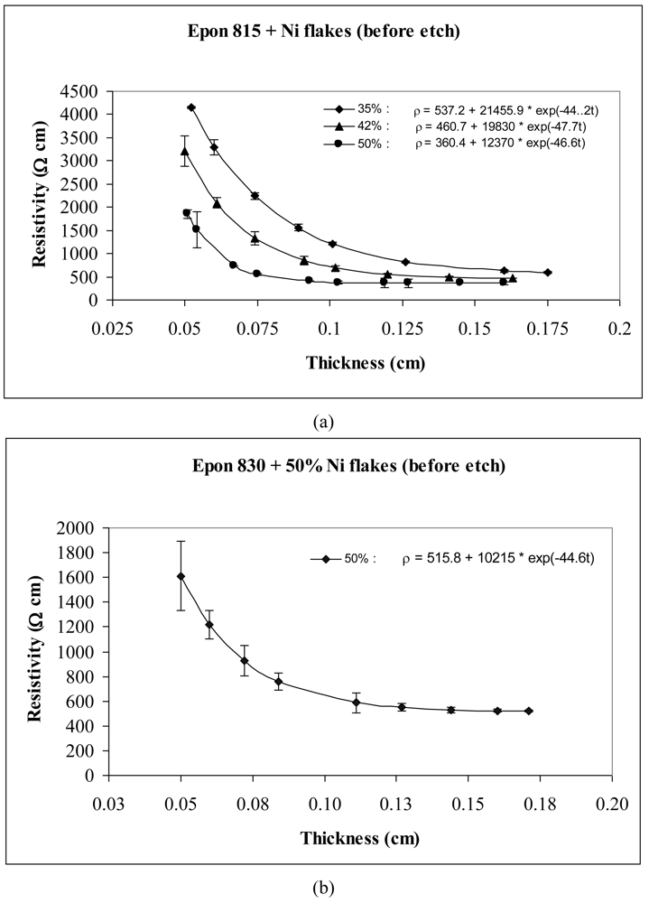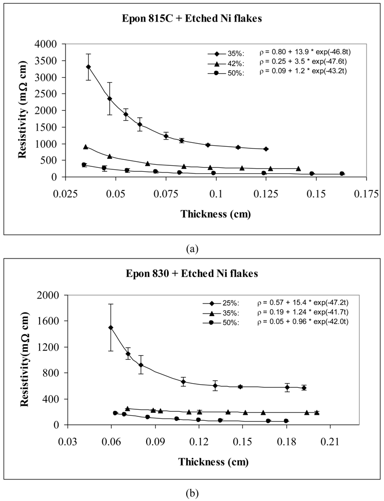 Our results on the thickness-dependent resistivity behavior of conductive particle filled epoxy resins reveal that the values of the governing Equation 14 parameters a, b and c depend on the particle filler volume fraction, etch treatment, prepolymer viscosity, particle type and particle shape. In unique case of the nickel flakes, the parameter c remains almost constant.