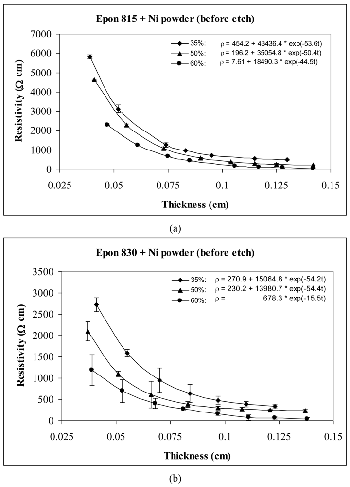 Comparison of Figures 3 and 4 reveals the effect of particle etching when nickel flakes are used. We can observe that the unetched nickel flakes induce higher resistivity in comparison to the etched flakes. The parameter a values of Equation 14 range between 360 to 537 Ω-cm with the unetched particles, and 0.05 to 0.8 Ω-cm with the etched particles. These findings indicate that removal of nickel oxide from the particle surfaces result in much diminished resistance. For the etched samples, the values of parameter b dropped dramatically by as much as 99.9%, while the values of parameter c did not change much.