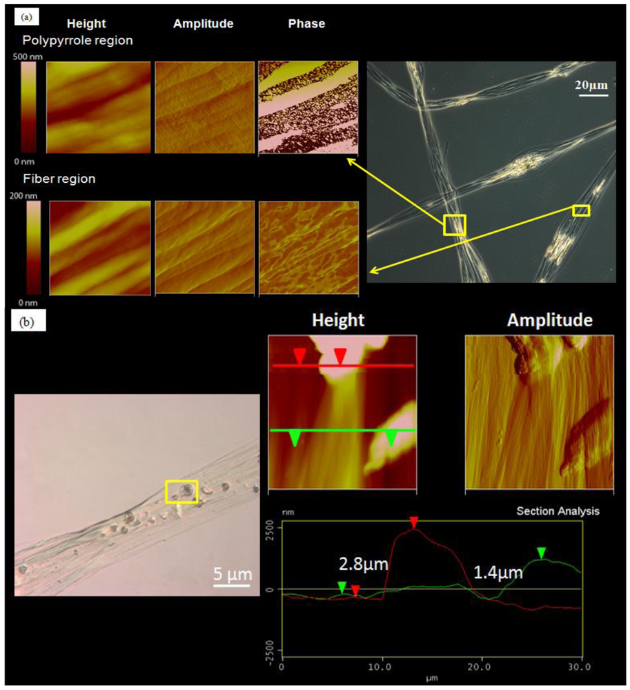 Figure 2. (a) AFM imaging of PPy-PEC fibers showing the height, amplitude and phase images of polypyrrole regions and fiber regions (where polypyrrole particles were absent).The obtained images are compared with the optical image of the scanned fiber regions (indicated by the boxes and arrows). AFM scan bars for polypyrrole regions and fiber regions are 2 μm and 1 μm respectively. (b) AFM imaging and section analysis of polypyrrole particles that were incorporated in PPy-PEC fibers. The AFM scan bar of the height and amplitude images is 10 μm. (c) Mechanical properties of PPy-PEC and PEC fibers (mean ± SD, n = 10).